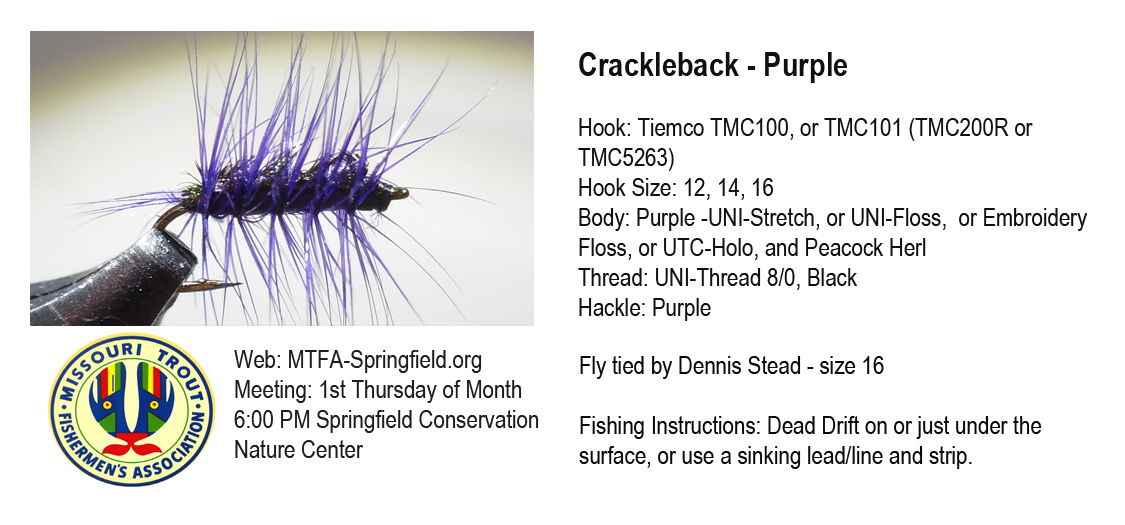 The Crackleback is an effective pattern that can be fished as a dry fly or a wet fly.  Tying it as a dry fly, used the dry fly hooks TMC100 or TMC101.  Tying it as a wet fly, use the wet fly hooks TMC200R or TMC5263.  It can be tied with different materials and colors.  See picture below.  Carolyn Parker from River Run Outfitters, ties the Pumpkin Crackleback using the UNI-Stretch Pumpkin.  Her fly introduced me to the UNI-Stretch thread and now use it for all my Cracklebacks.  Two tying tips: when tying off the UNI-Stretch, suggest that you start a new thread UNI-Thread 8/0 black to tie off the UNI-Stretch.  This will eliminate the buildup of thread around the eye of the hook.  And second, I use a little super glue on the top of the body before I pull the Peacock herl forward.  This will give the fragile herl strength, and also keep the herl from sliding down the sides. These flies are a must for any fly box and suggest that you have extras and some in all color combinations.