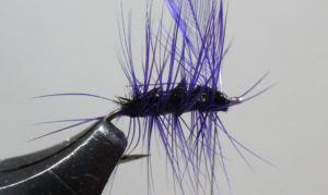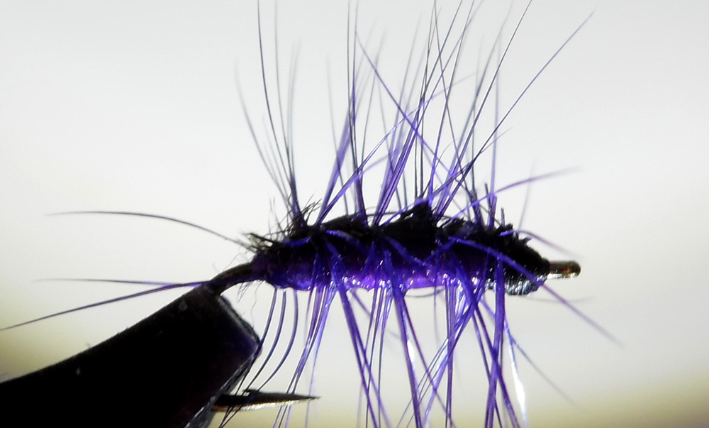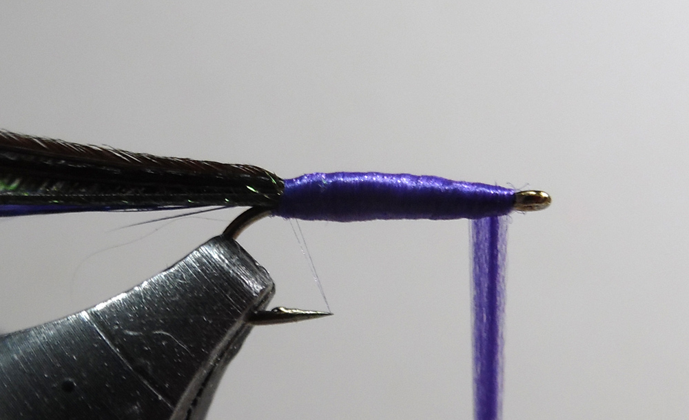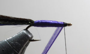 • Body: Purple – UNI-Stretch, or UNI-Floss, or Embroidery Floss, or UTC-Holo, and Peacock Herl