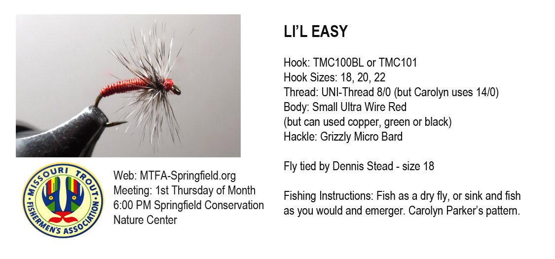 Did you know that this pattern “LiL Easy” was created in 1996 by Carolyn Parker of River Run Outfitters?  She created it as a dry fly or just sinking under the surface.  I found out about it from Ty at the Plateau Fly Shop.  He said that Carolyn had a great fly called the little easy.  I could not find it on their web site, so I asked about it and she gave me the recipe.  Here it is. (PS- check out River Run Outfitter’s web site – http://www.riverrunoutfitters.com/ )