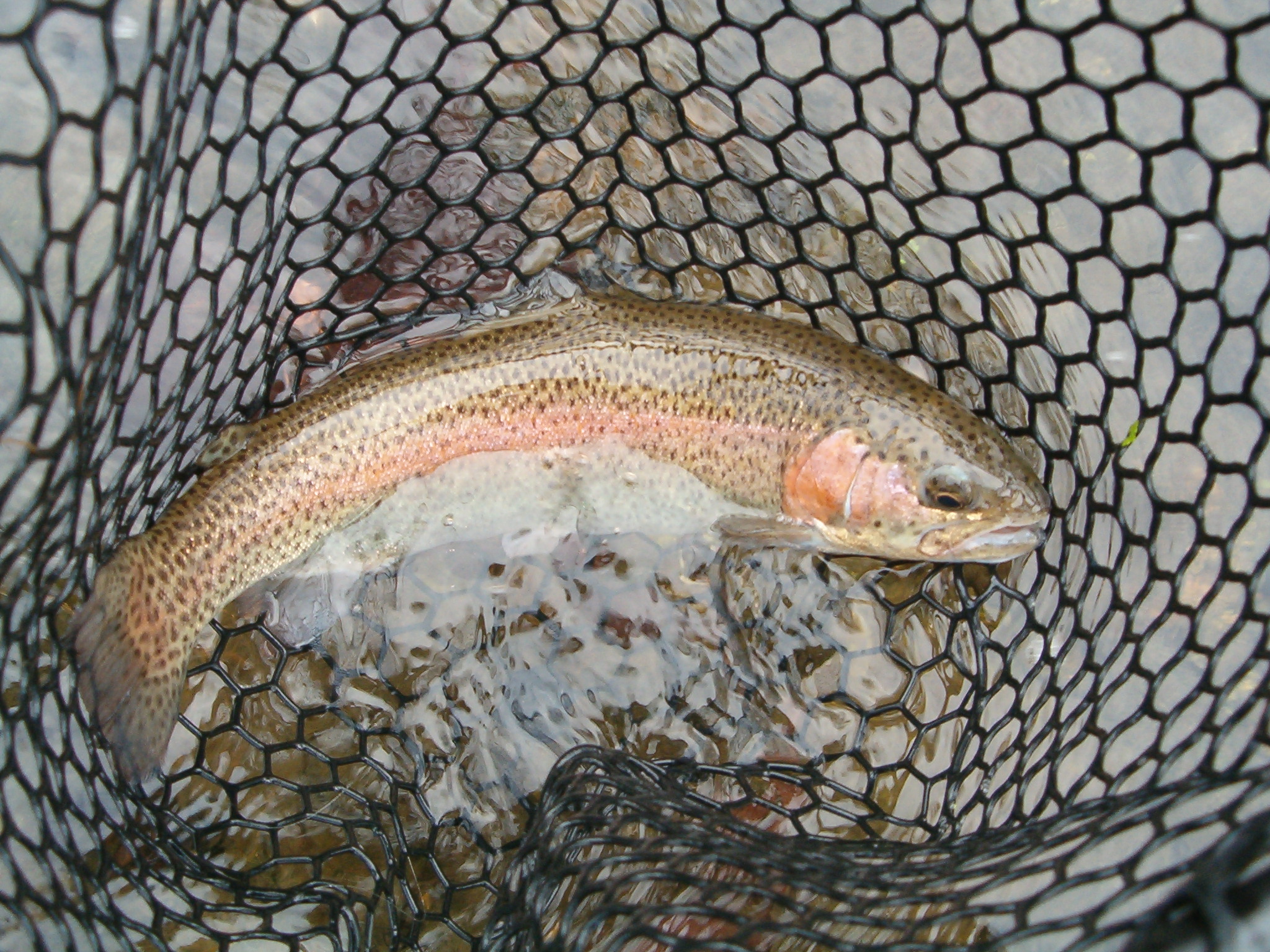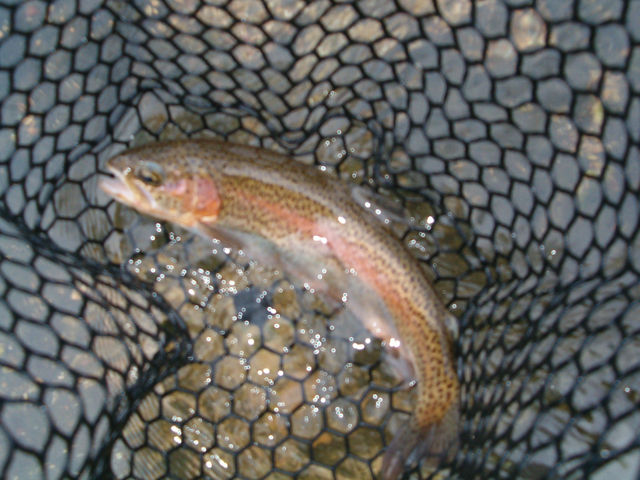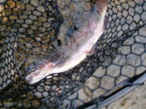 What I could gather for the afternoon was also variable. Dick Solomon guessed that he had landed at least 40 fish. I was fishing near him and can attest that he was pulling them in right and left, sometimes two at a time. He was using a pellet fly with another as a dropper. I was also using a pellet fly and standing within 30 feet of him but with much less success. He pointed out to me that I needed some small weight to get it off the surface. I did indeed catch more fish after that.