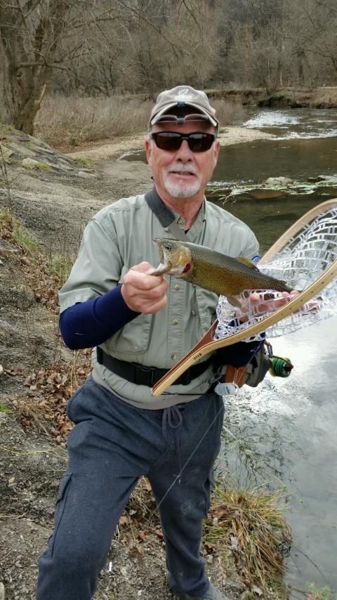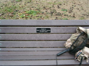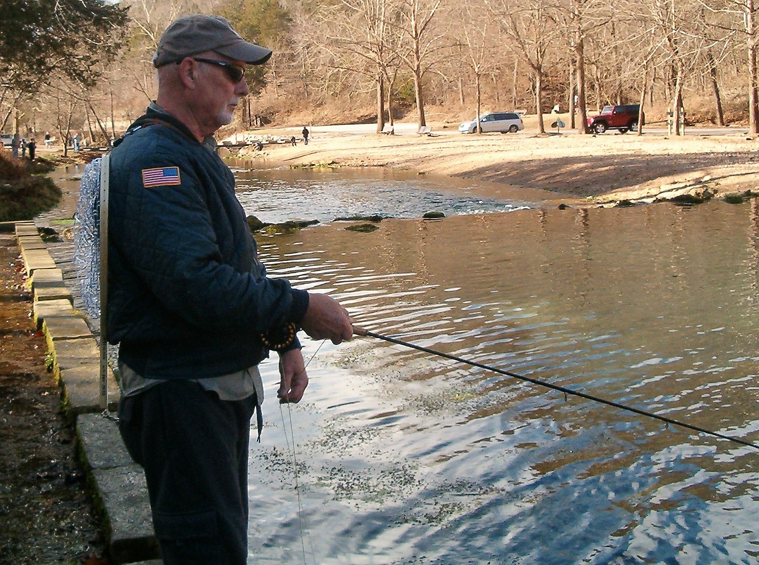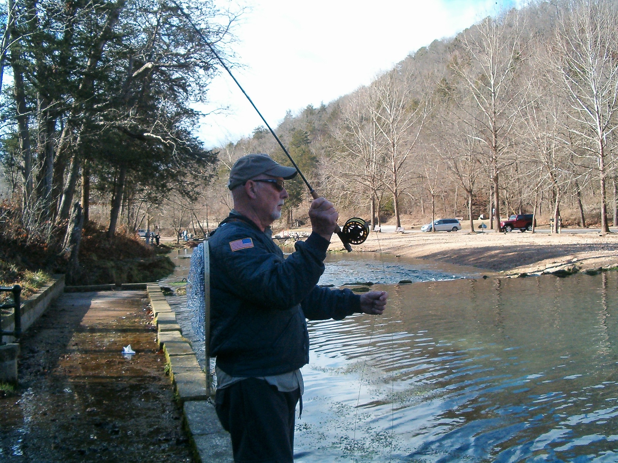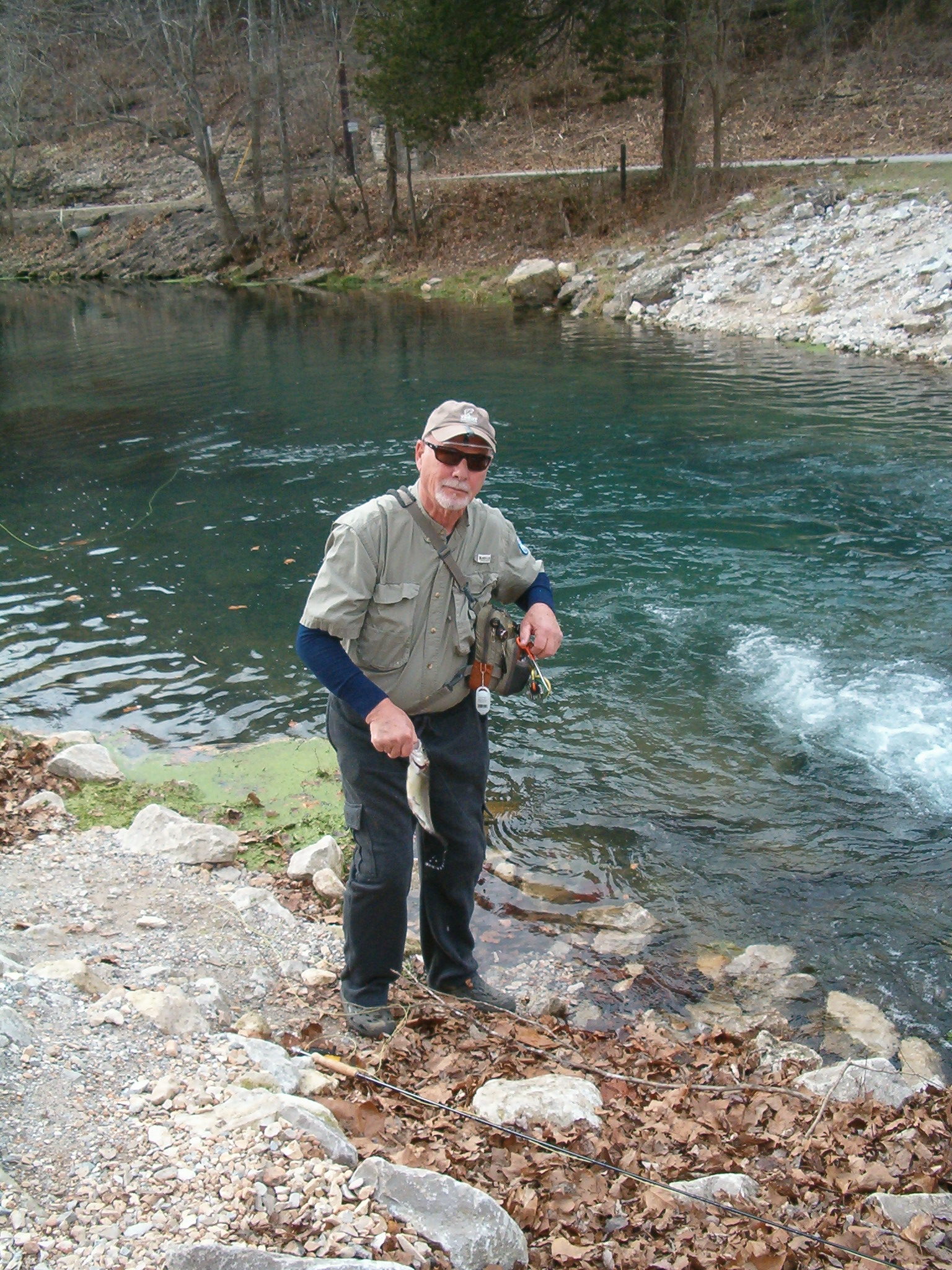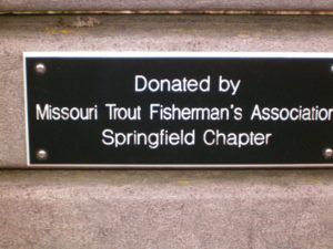 Seven of us went to Roaring River State Park Saturday during the catch and release season. It was a beautiful day but the fishing was mixed. Attending was John Bush, Dick Solomon, Larry Olson, Dan Ditzler, Chuck Penland, Chuck’s guest, Mike, and myself. Dan was sporting a brand new split bamboo rod, fished for the first time on this trip. I didn’t get to see it but Dan says it has a very smooth and accurate presentation. Several of us began fishing in the pools across from the historic CCC lodge. I know of seven fish caught there all on the Dorsey top secret midge in either black and brown, size 20, or on the Ruby 2 midge, probably size 18. We ran into Chuck and Mike at that location but they fished further down stream. Dick fished around the big outflow of the hatchery and cleaned up, stating that he quit counting at 50. I witnessed some of that action and he truly caught them right and left. We moved up near the outflows. I still had midges tied on and didn’t expect the outflow trout to choose them but they did. While Dick was trying different patterns, I stayed with midges until I lost a couple then I picked out a brown Tabou Caddis fly just about the time they started feeding fish in the raceways. I caught a few on that fly in the feeding frenzy until I spotted a young couple nearby. He was trying to teach her to fish, so I motioned them over and let them take my spot. I checked with John who was a little upstream. He had caught two or three more on the Dorsey’s and Ruby 2’s. I watched from a distance as Larry brought in a nice one I think on a prince nymph. We lunched and met up with Dan, Chuck, and Mike. After lunch, John, Larry, and I went down to zone 2 below the bridge. We each caught a fish or two but it began to slow down. There were quite a few anglers down there but not many fish brought in. I spotted a bench and decided to rest. I noticed that the bench had been donated by an organization called the Springfield Chapter of the Missouri Trout Fishermen’s Association.