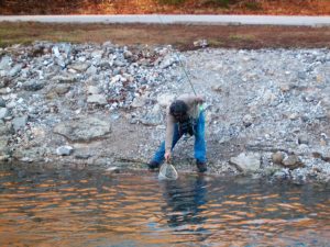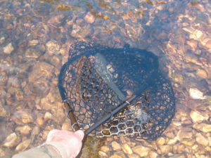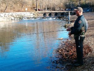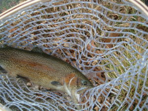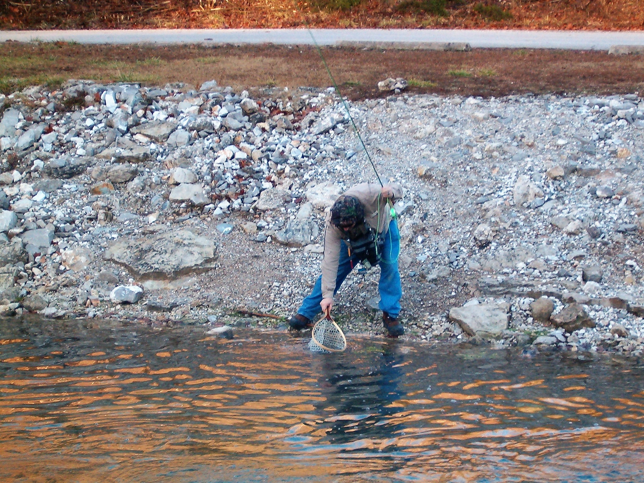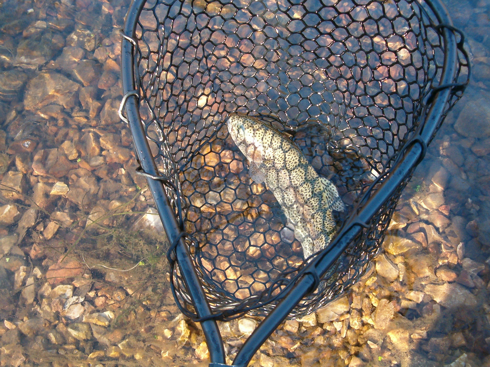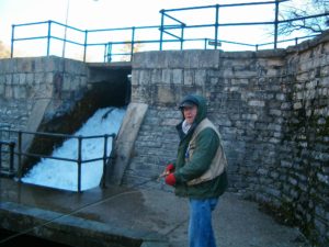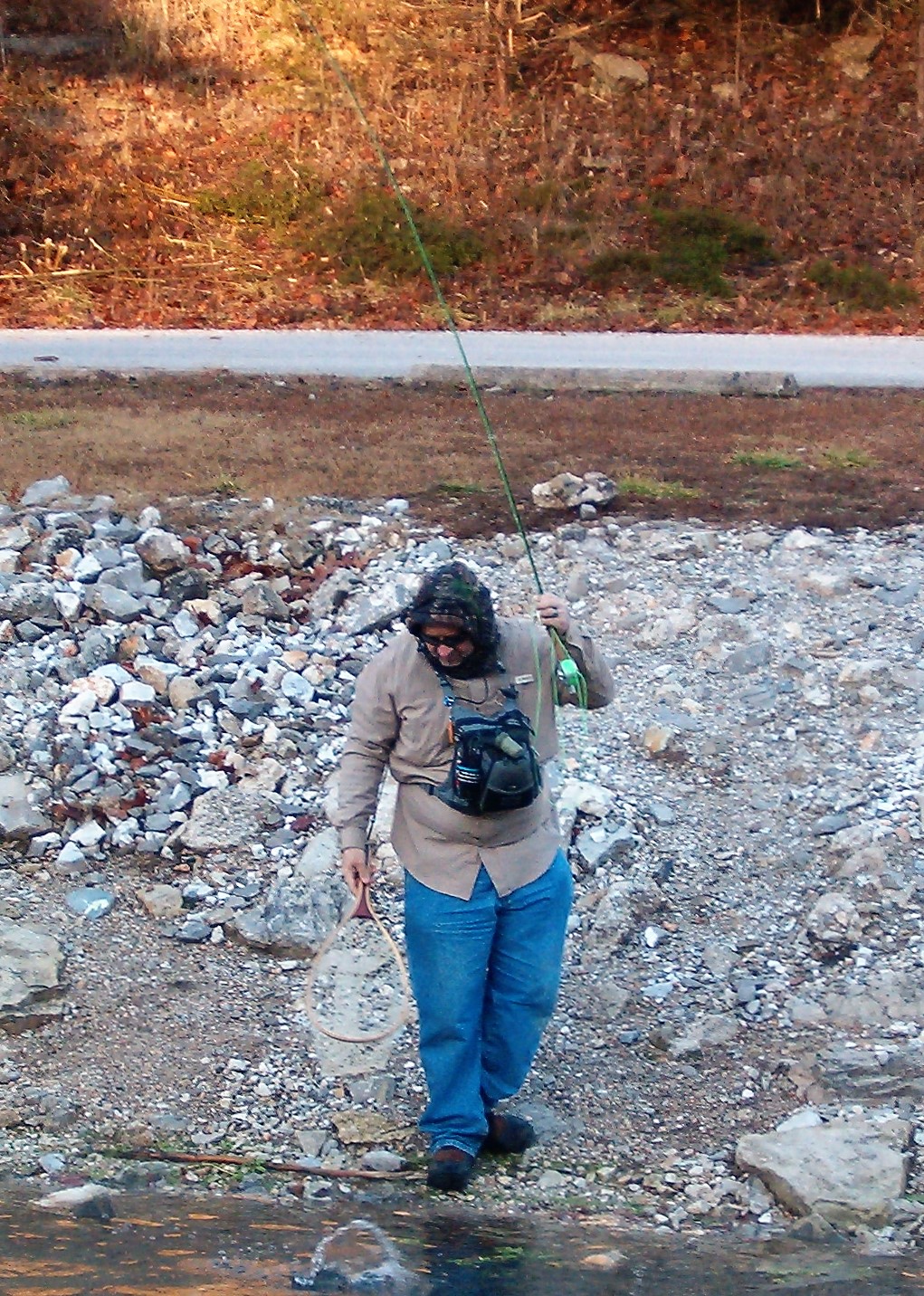 Seven of us went to Roaring River State Park Saturday during the catch and release season. It was a beautiful day but the fishing was mixed. Attending was John Bush, Dick Solomon, Larry Olson, Dan Ditzler, Chuck Penland, Chuck’s guest, Mike, and myself. Dan was sporting a brand new split bamboo rod, fished for the first time on this trip. I didn’t get to see it but Dan says it has a very smooth and accurate presentation. Several of us began fishing in the pools across from the historic CCC lodge. I know of seven fish caught there all on the Dorsey top secret midge in either black and brown, size 20, or on the Ruby 2 midge, probably size 18. We ran into Chuck and Mike at that location but they fished further down stream. Dick fished around the big outflow of the hatchery and cleaned up, stating that he quit counting at 50. I witnessed some of that action and he truly caught them right and left. We moved up near the outflows. I still had midges tied on and didn’t expect the outflow trout to choose them but they did. While Dick was trying different patterns, I stayed with midges until I lost a couple then I picked out a brown Tabou Caddis fly just about the time they started feeding fish in the raceways. I caught a few on that fly in the feeding frenzy until I spotted a young couple nearby. He was trying to teach her to fish, so I motioned them over and let them take my spot. I checked with John who was a little upstream. He had caught two or three more on the Dorsey’s and Ruby 2’s. I watched from a distance as Larry brought in a nice one I think on a prince nymph. We lunched and met up with Dan, Chuck, and Mike. After lunch, John, Larry, and I went down to zone 2 below the bridge. We each caught a fish or two but it began to slow down. There were quite a few anglers down there but not many fish brought in. I spotted a bench and decided to rest. I noticed that the bench had been donated by an organization called the Springfield Chapter of the Missouri Trout Fishermen’s Association.