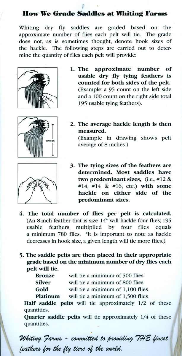 Well here are my thoughts on the above. A few years ago, I bought my first ¼ saddle for midge sizes from River Run Outfitters. I could have purchase a Whiting 100 pack for $20 but bought the ¼ midge saddle for $42.00. The feathers were longer and with 3 feathers, I tied 30, size 14 Black Gnats. Whiting states an 8-inch feather that is size 14 will hackle four (4) flies.