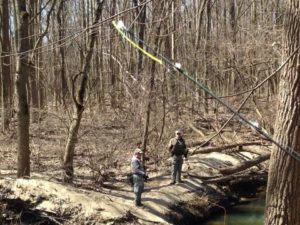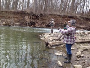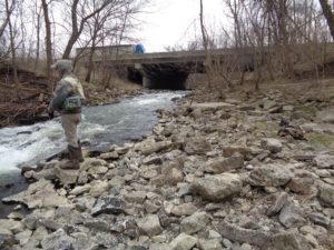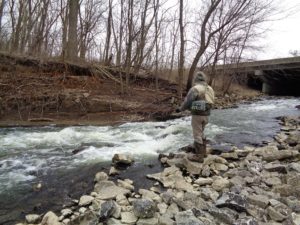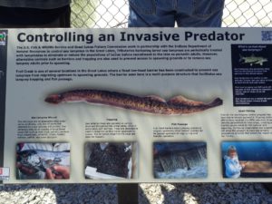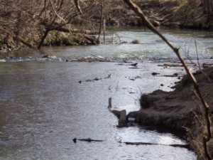 Steelhead are an anadromous rainbow trout which are hatched (born, if you prefer) in Lake Michigan tributaries and, at a certain stage in their growth, travel downstream into the lake. They remain there, growing large on the bountiful food sources, then travel back up the tributary where they were born to spawn. Steelhead are not native to Indiana. The state has a stocking program that includes a hybrid steelhead called the “Skamania steelhead trout. The Skamania strain originated from a selective breeding program of early migrating steelhead in Washington state.” There are two steelhead spawns, late winter and summer. No, I don’t think an individual fish spawns twice a year and I don’t know why there are two except that mixing rainbow trout DNA with salmon DNA yields a crazy, mixed up fish that has a warm-water spawn. Wanting to avoid ticks and mosquitoes, we chose the winter run. Someone asked me if they went all the way to the Atlantic. I responded that they might make it, but they would have a hard time jumping Niagara Falls on the return trip to spawn. Unlike some other anadromous salmonids, they do not necessarily die after the spawn but may return to the lake and back again several times during their lives. This area of Indiana also has coho salmon, chinook salmon, brown trout, and other cold-water fish.