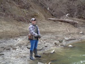 Using the long-arm photo technique, this pip-squeak looks respectable. Larry could see one in the creek but it kept going.