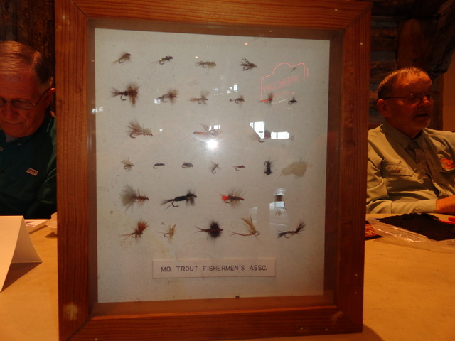 A fly display box from years past. It was dropped off by someone who was evidently returning it after years in his possession. He refused to answer questions how he got it. Herb Knight remembered when our club put it together many years ago.