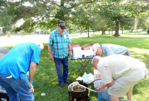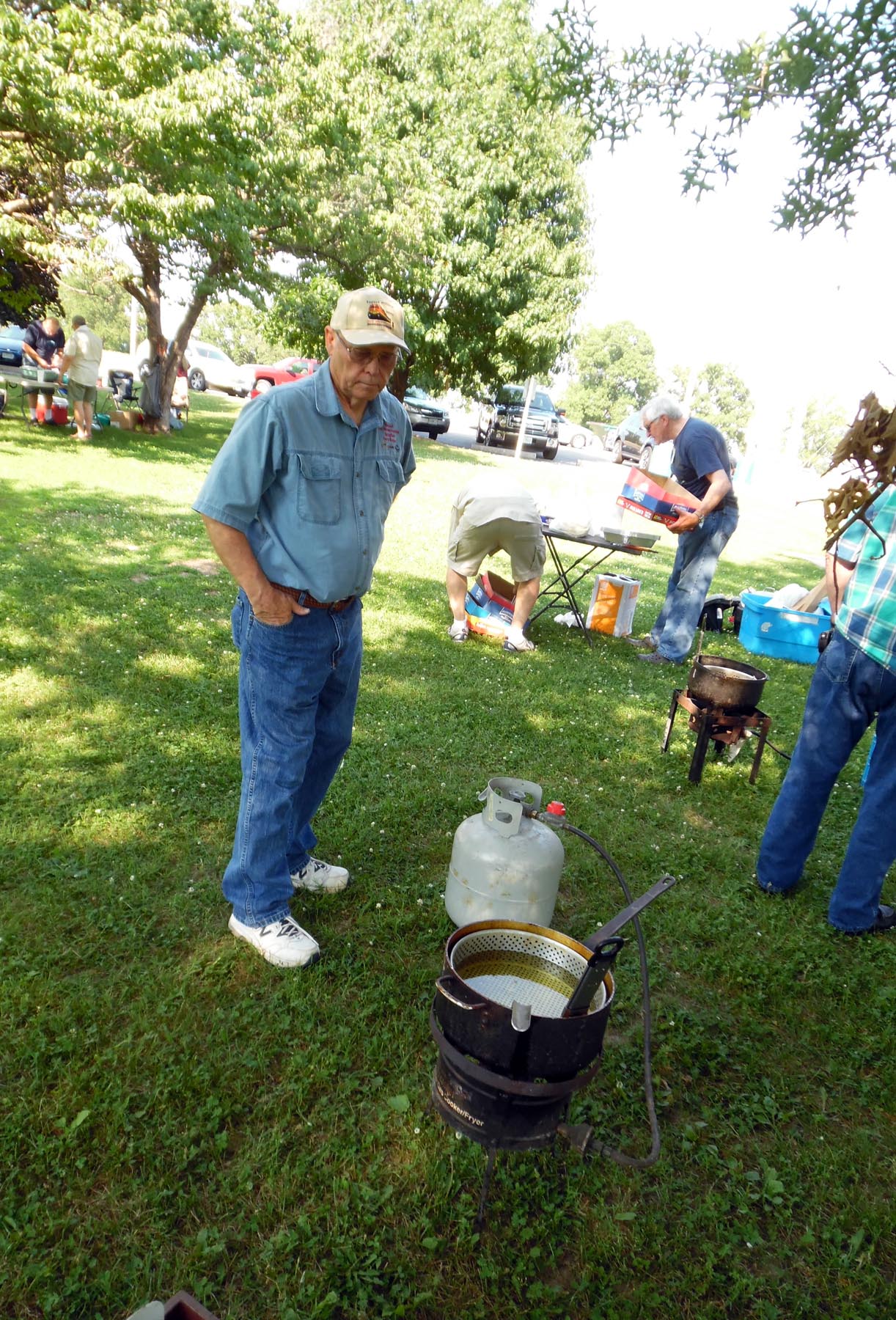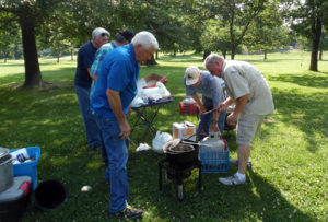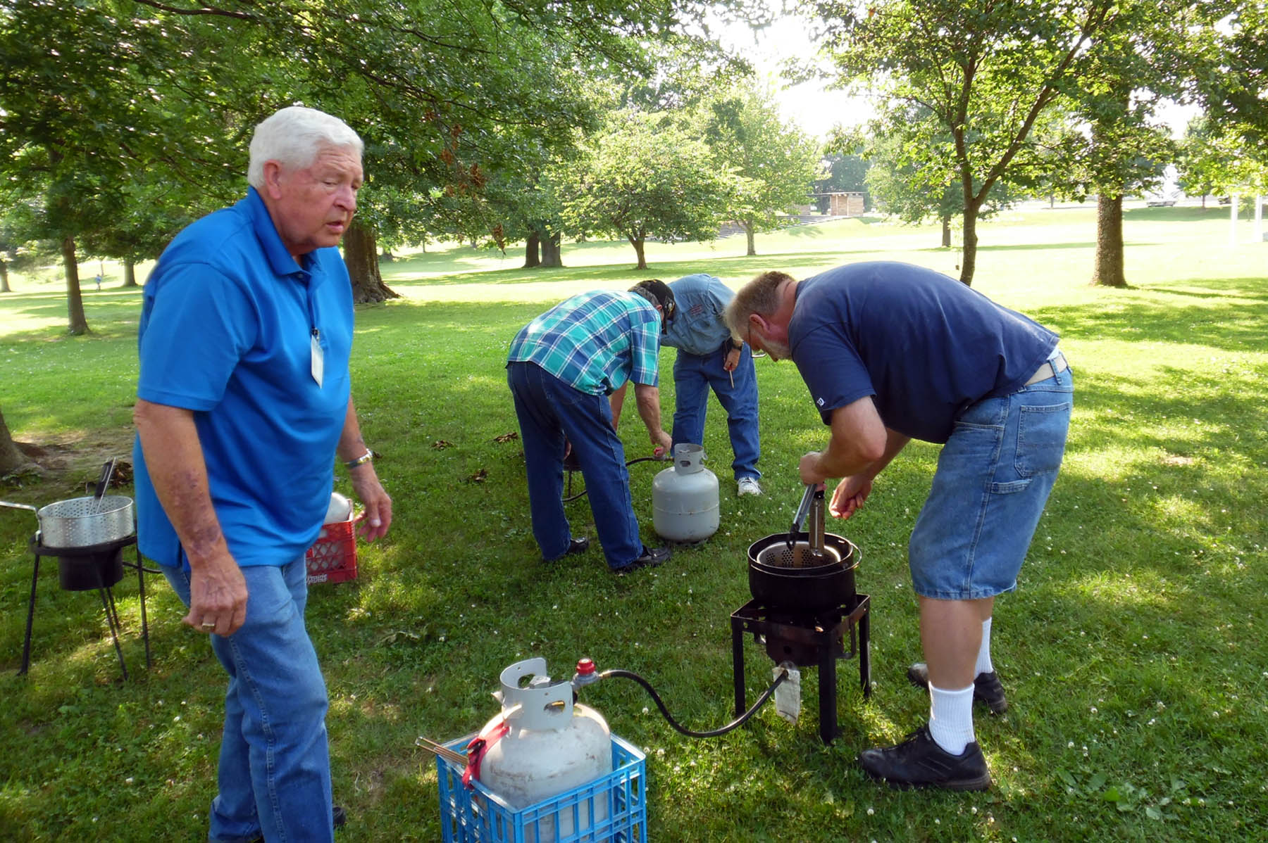 Charlie Collins, Charlie Gregory, Harry Morgan, and Bill Huyett. How many trout fishermen does it take to light the burner?