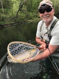 Four of us went on a camping/fishing trip Thursday, 4/13 through Saturday, 4/15 to the Northfork River in Arkansas. Todd Fecho went down a day early and left a day early so he could take his kids to Easter celebrations. Larry Olson, John Bush, and I (Bob Randall) went for the other dates. Larry couldn’t sleep so he got up early and hit the road. He got in a lot of fishing that day. John and I were off to a much later start. Larry cleaned up with 9 fish on Thursday, Todd caught 6, John caught 6, and I limped along with only 3. Check out Larry’s nice brown. Larry usually fishes nymphs with no strike indicator. He likes to feel the bite.