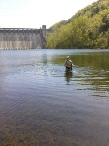 Let me note that Todd caught 6 or so on Wednesday before the rest of us arrived. We camped at the Quarry Campground below the Norfork Dam. Camping out was great fun. Larry is a retired firefighter who did a lot of cooking in the firehouse for the rest of the crew. He does great as the camp cook and has been elected to be Chief Cook and Bottle Washer for all future campouts. Friday was a beautiful day. Three of us went down stream to the Ackerman Access. Todd stayed behind since this was his last day and he wasn’t sure how long he would be fishing before breaking camp. The river was beautiful but not very productive. Over about two hours of fishing I had a few strikes and one unintended mid-stream release. Neither John nor Larry did well at that location either. We returned to the Quarry Park, ate lunch, said good-bye to Todd, and hit the water again. I began to feel overwhelmed with the 80ish degree heat and didn’t fish long. Larry and John did fair. John was catching them on a black wooly bugger and an olive wooly bugger with lots of flash tied in. Larry caught a few on a black leach pattern. I spent the rest of the day in camp…skunked for the day and frankly, a little under the weather. I had a nice nap. Next morning we were fishing before the sun was up. I used wooly buggers and caught three, one was pretty nice. John did well using wooly buggers and Larry had a slow morning. Breakfast was worth the wait. Then Larry and I went back out. I believe that the next time I go to that river I’ll take my kayak and fish the hole just below the dam. We all had fun. Todd, I thought I had taken a picture of you at camp but darned if I can find it. Sorry.