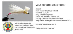One of a popular fly used in the Ozarks is the Elk Hair Caddis (Lt). This fly is a little different because the hackle has been left off. This variation will work well. When I first started tying this fly, I did not use the Yearly Elk Fur and did have some issues. Since then I purchase Yearling Elk Hair from Spirit River Inc, pictures below.