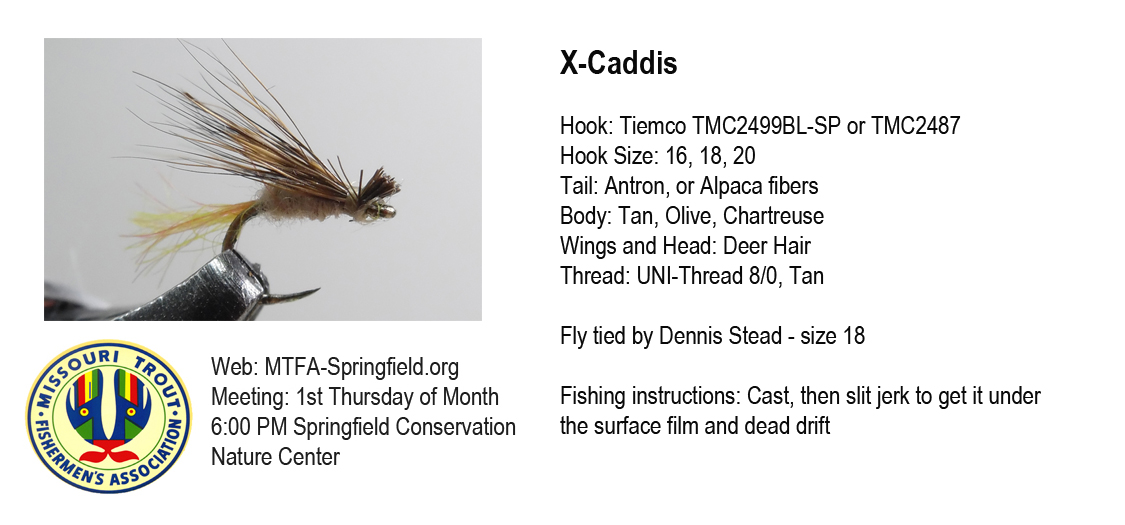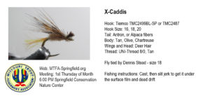 Sam Stewart an MTFA member like the x-caddis. Per Sam, X-Caddis represents a crippled caddis, an adult that has not successfully emerged from the pupa case. Since caddis normally emerge quickly and do not linger on the surface like mayflies, the only adults readily available to trout during the hatch are pupae and cripples. Trout know the cripples aren’t going anywhere, so they focus on them. Cripple patterns such as this are especially effective on clear, slow water where trout can become exceptionally selective.