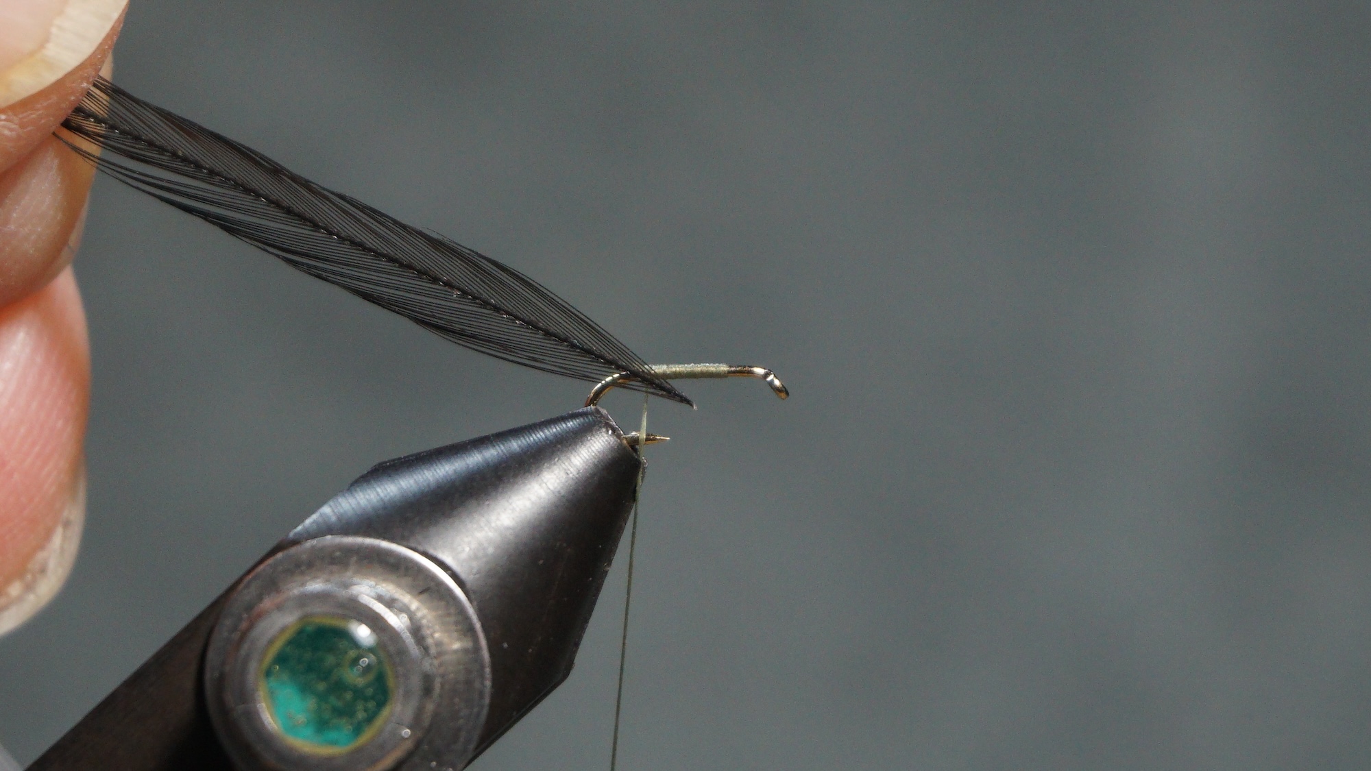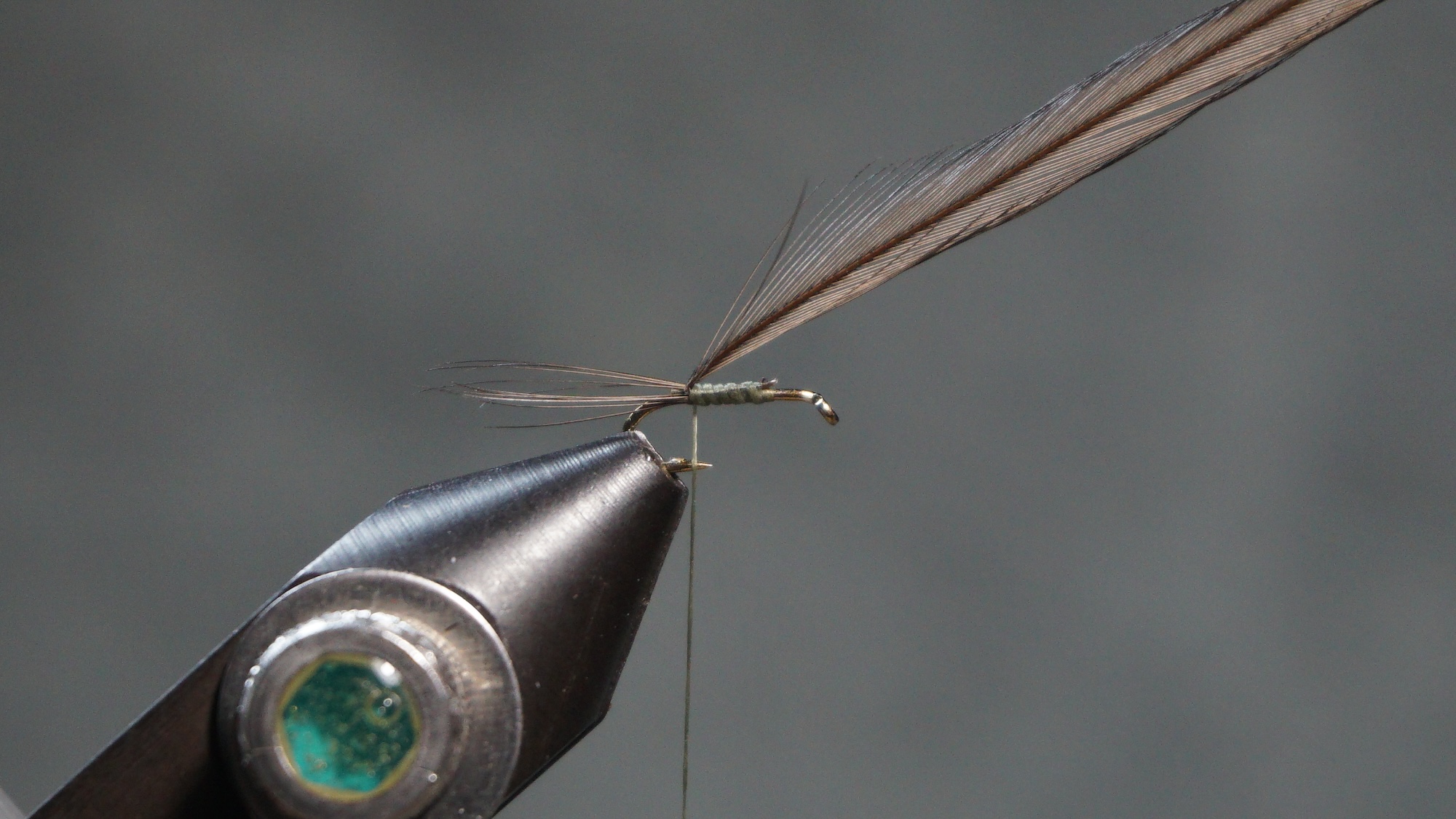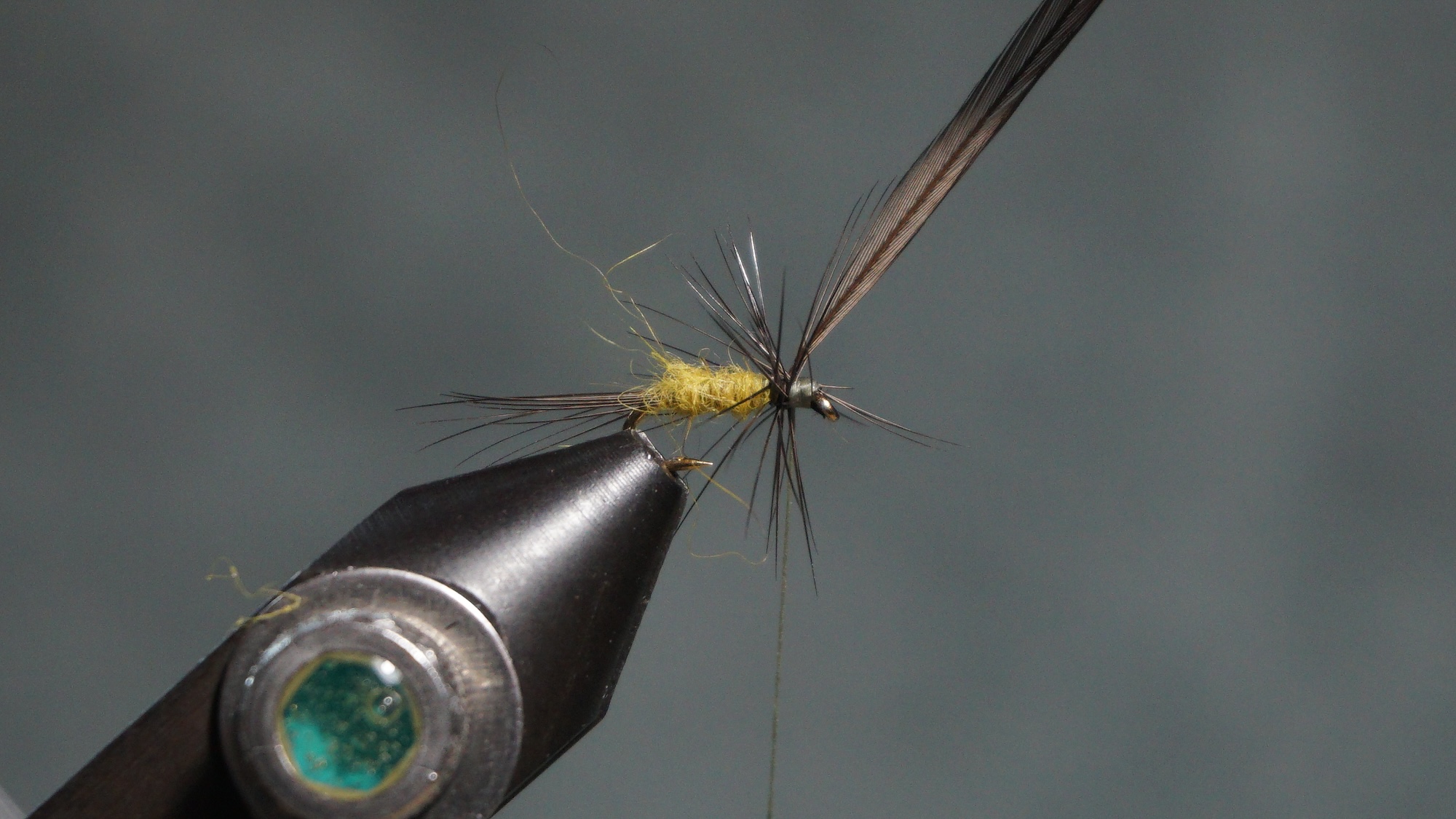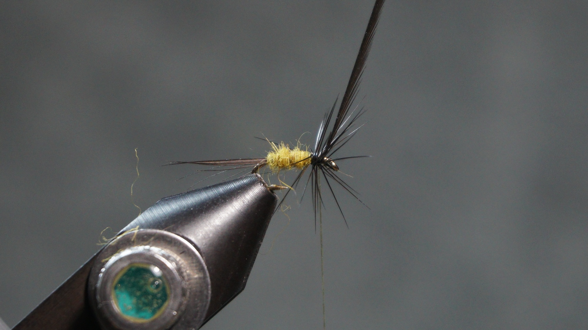 Front hackle: dark dun dry fly sized (1.5 hook gape) to hook