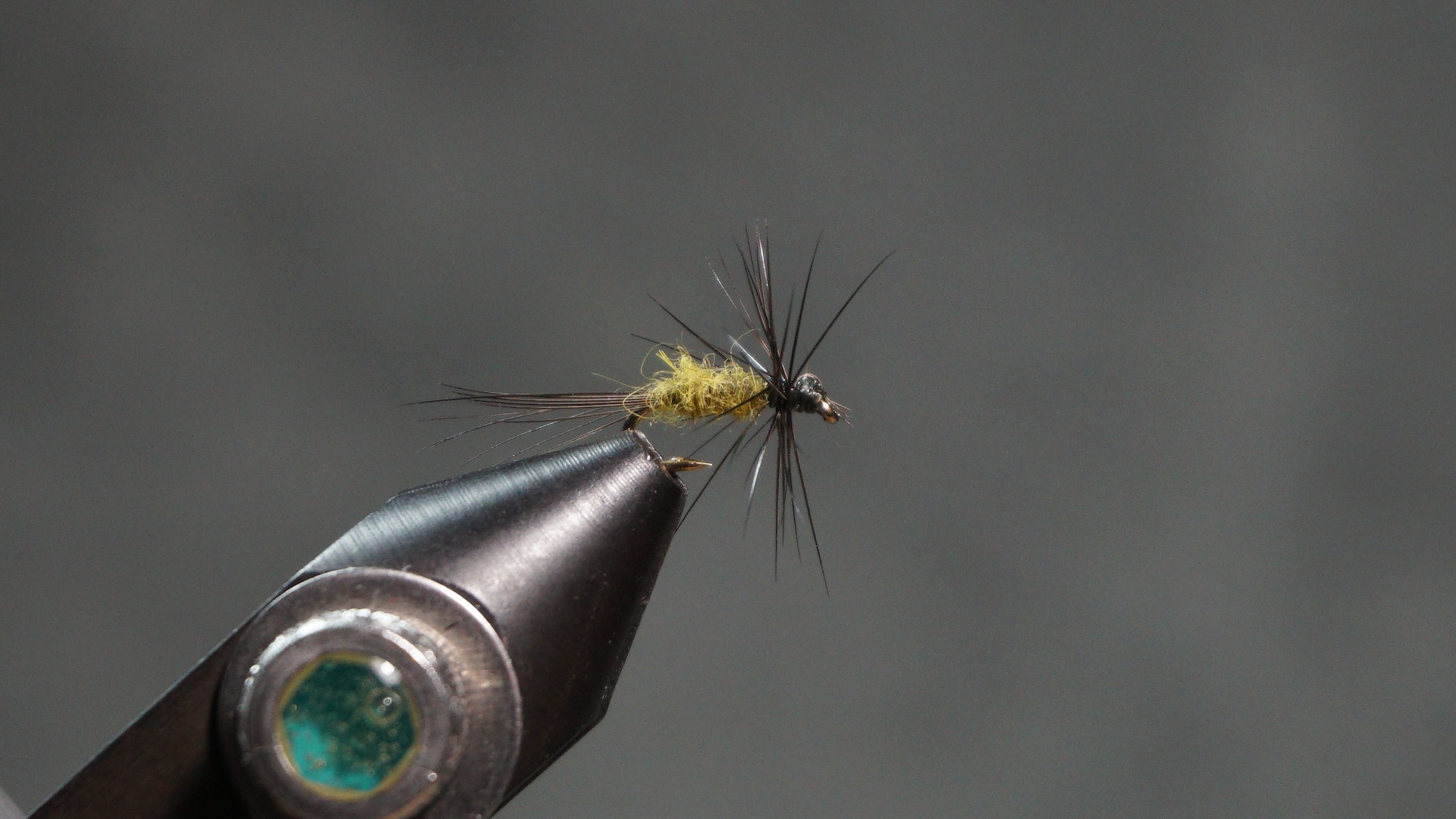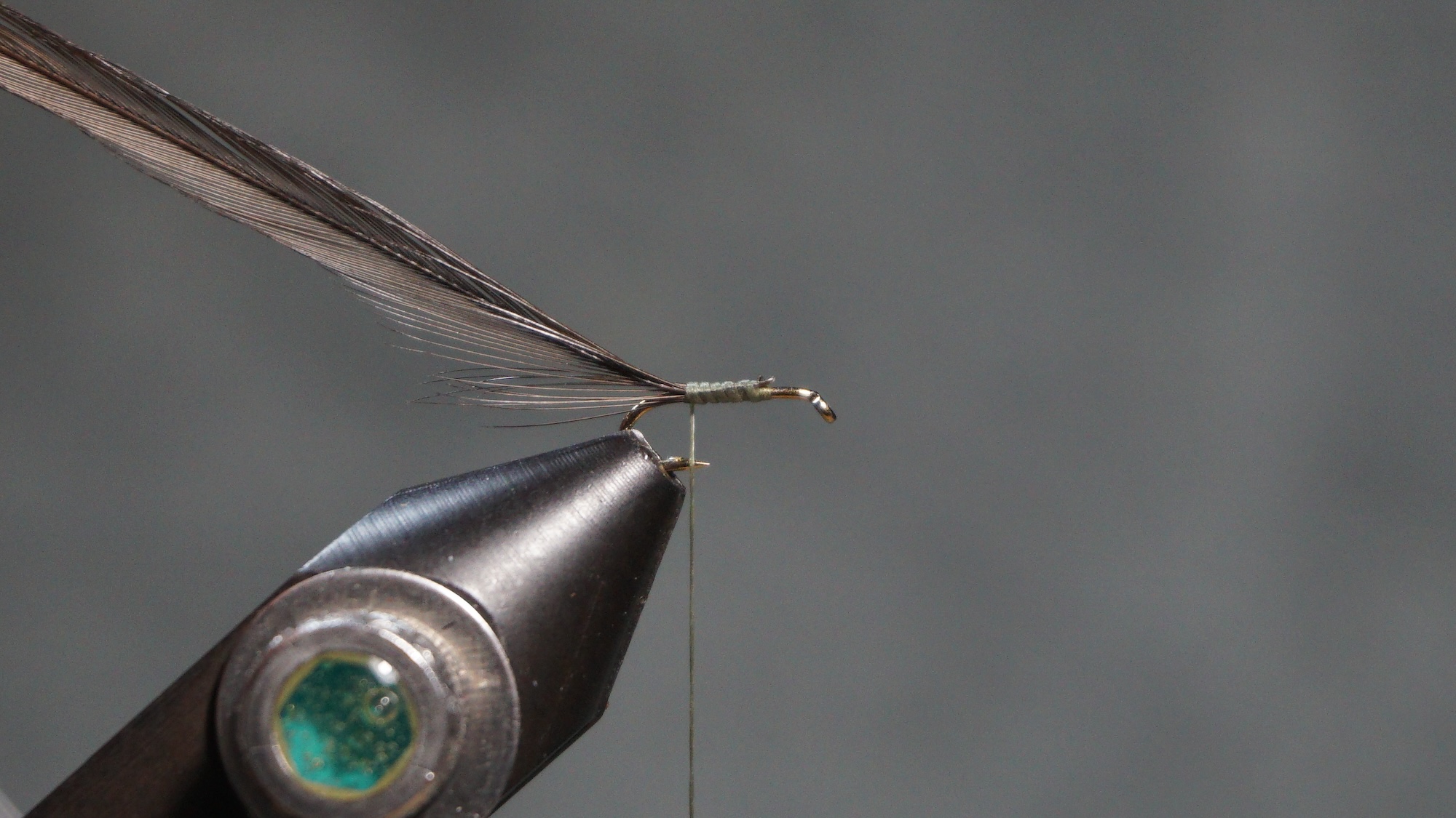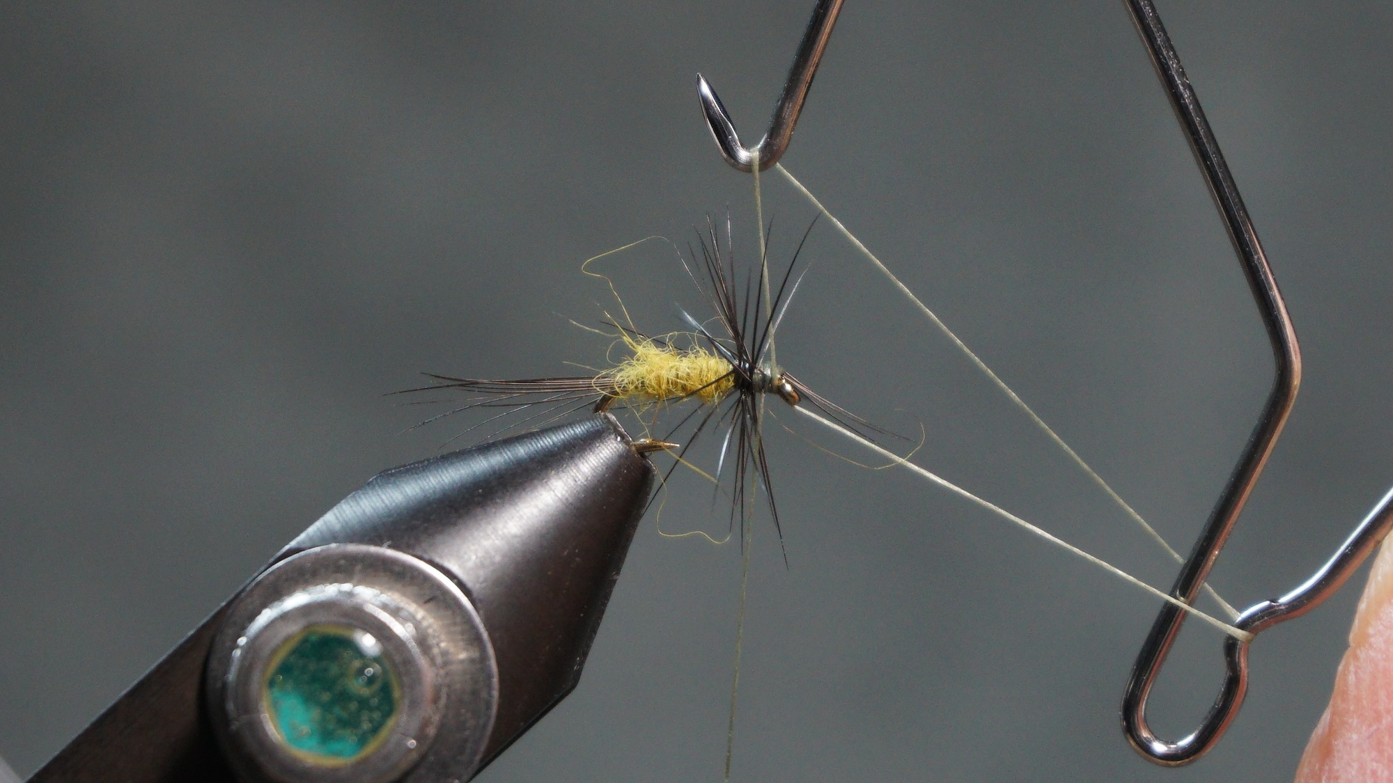Front hackle: dark dun dry fly sized (1.5 hook gape) to hook