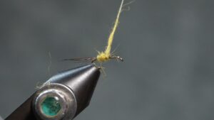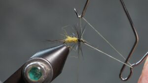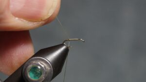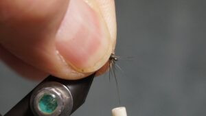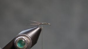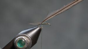 Tie in tail with hackle fibers length of hook shank; NOTE: on a small hook tie in the but end of a sized dry hackle with the hackle hanging off the bend of the hook, pull the hackle back toward the eye and snap off leaving a few fibers for the tail