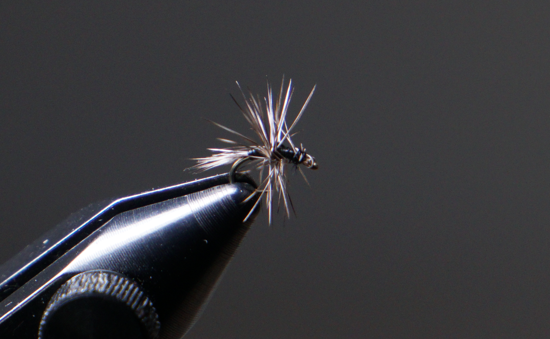 Tie in hackle shiny side up and create collar with two wraps or as desired. Tie off