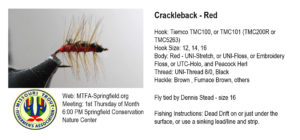 The Crackleback is an effective pattern that can be fished as a dry fly or a wet fly. Tying it as a dry fly, used the dry fly hooks TMC100 or TMC101. Tying it as a wet fly, use the wet fly hooks TMC200R or TMC5263. It can be tied with different materials and colors. See picture below. Carolyn Parker from River Run Outfitters, ties the Pumpkin Crackleback using the UNI-Stretch Pumpkin. Her fly introduced me to the UNI-Stretch thread and now use it for all my Cracklebacks. Two tying tips: when tying off the UNI-Stretch, suggest that you start a new thread UNI-Thread 8/0 black to tie off the UNI-Stretch. This will eliminate the buildup of thread around the eye of the hook. And second, I use a little super glue on the top of the body before I pull the Peacock herl forward. This will give the fragile herl strength, and also keep the herl from sliding down the sides. These flies are a must for any fly box and suggest that you have extras and some in all color combinations