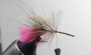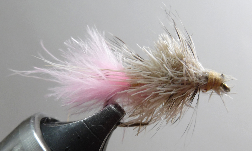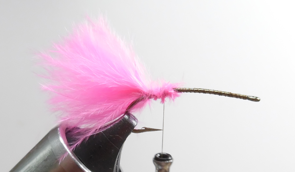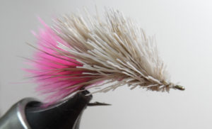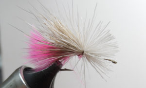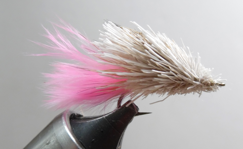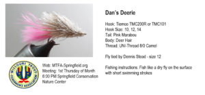 I named this fly Dan’s Deerie.  The reason for the name came from a cigar smoking, MTFA member, who loves to fish and yes, catches fish – Dan Ditzler.  At an MTFA meeting I was asking the members to give me some of their favorite flies.  Dan came up to me, took off his hat, and gave me a fly that was attached.  The first picture of that fly is above.  He said that this fly catches Sun Fish.  He told me that it was a simple fly to tie and gave me some information on it.  I put it with my other flies, and forgot about it.  Just the other day, I found his fly and started tying it.  It looks close to Dan’s but if it was on his hat, it was well fished and beat up.   I used pink marabou and Deer hair – thus the name.   If this is wrong, Dan will have me correct it.