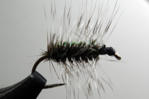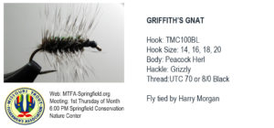 The Griffith’s Gnat, a dry fly) was created by George Griffith. A small woolly bugger without a tail. On of Harry Morgan’s favorite fly. It seems that this fly represents a lot of different bugs.
