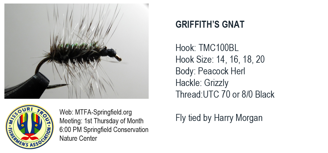 A very simple fly to tie. Suggest that you also tie it in a tan or ginger colors. One day at Roaring River, I watched this one fly fisherman catch a trout just about every time he made a cast. When the fly was lost, I approached him. He was tying on a Griffith’s Gnat but the color was a tan or ginger color.