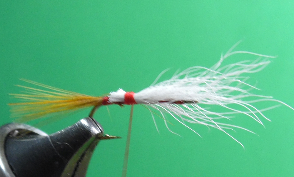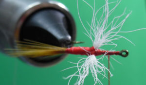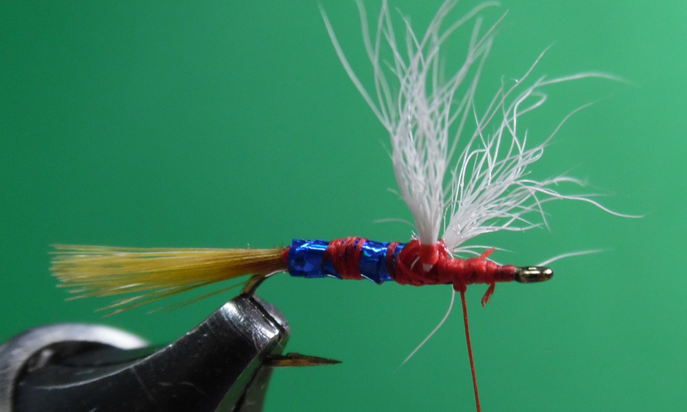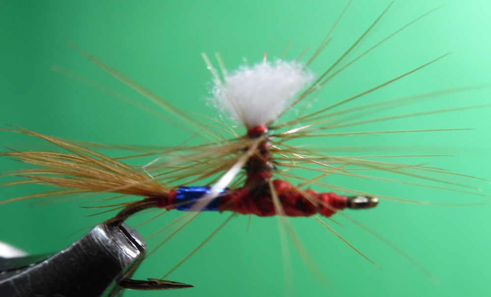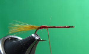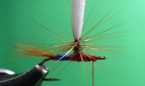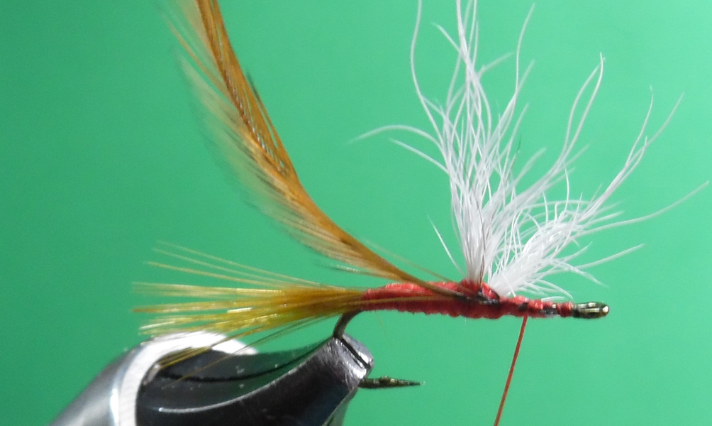 - Hackle: Ginger or Brown Three wraps behind the wing and five in front of the wing.
