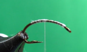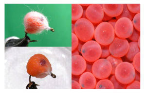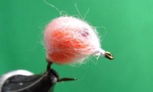 Fishing Instructions – The egg/midge combination. The midge is tied about 14 to 16 inches from the egg, and a small lead weight about 14 to 16 inches above the egg. Fish it at the edge of fast moving water and stripped back. A sinking leader or line can also be used.