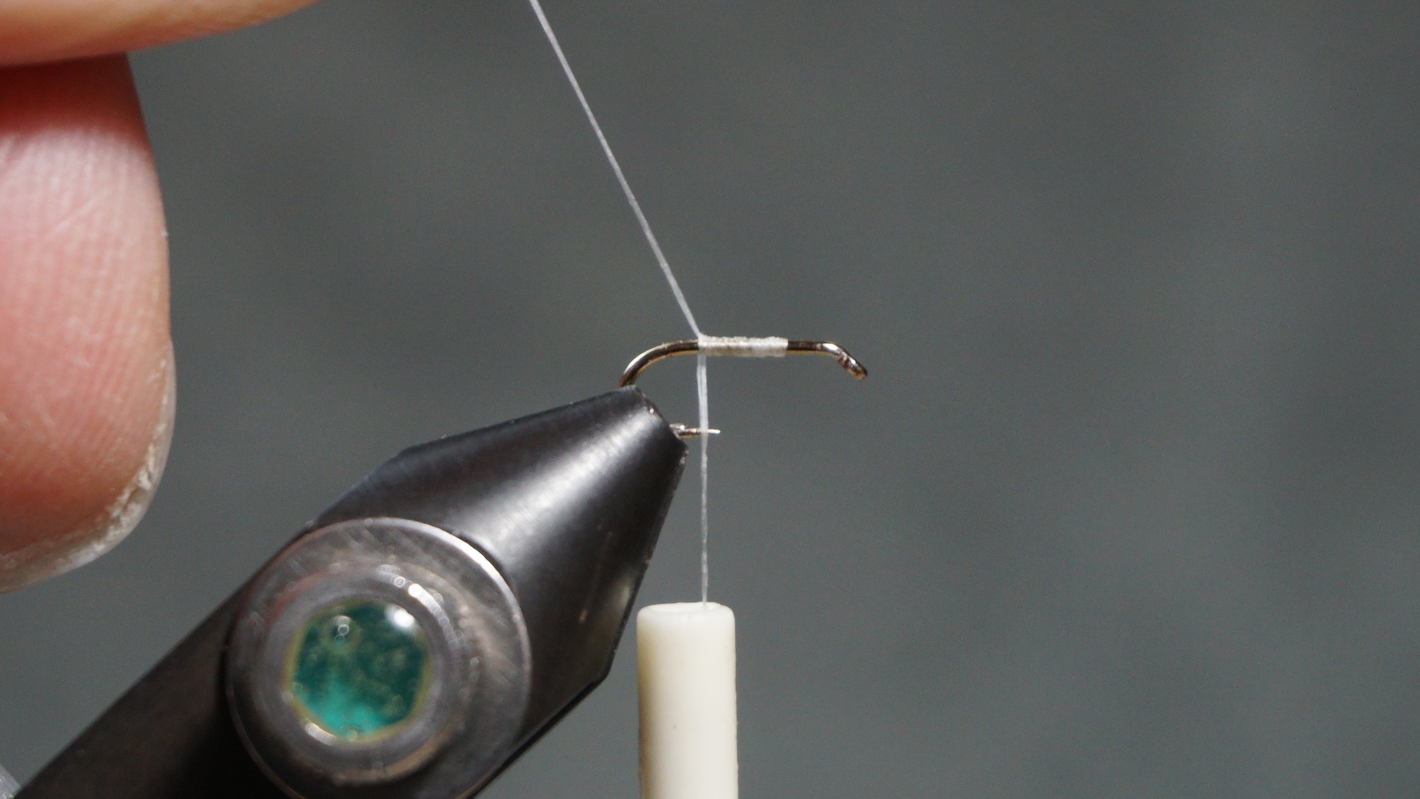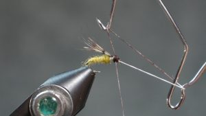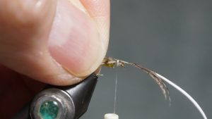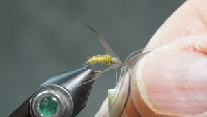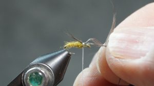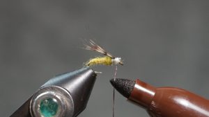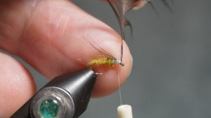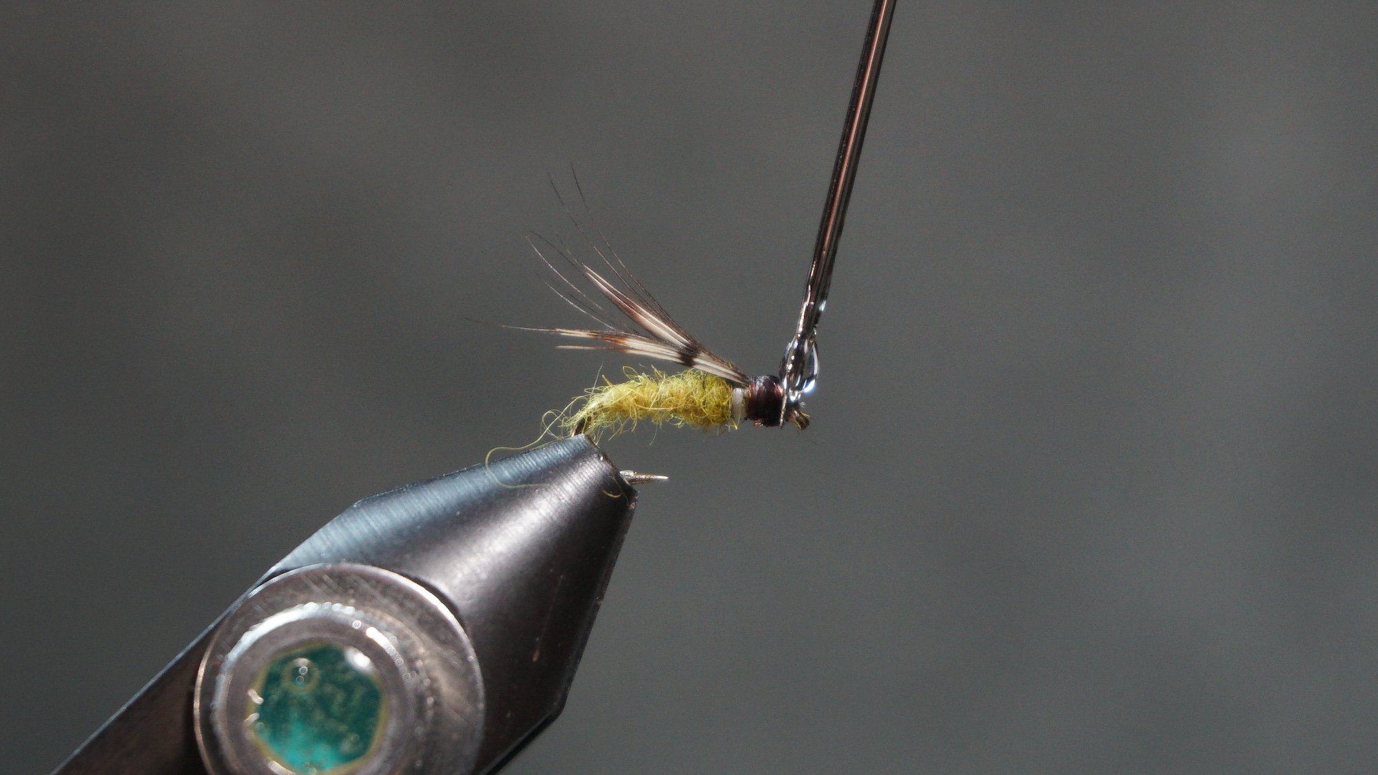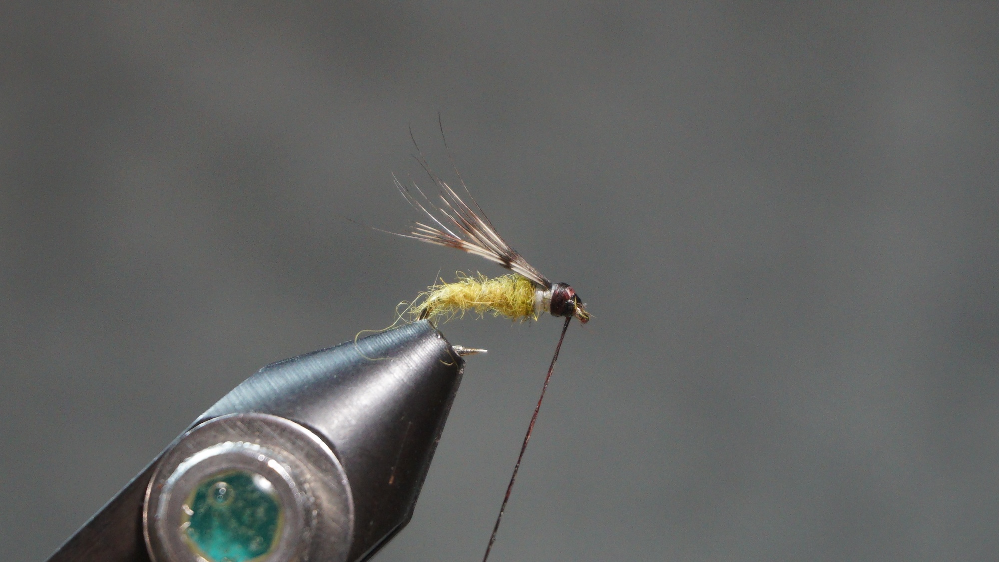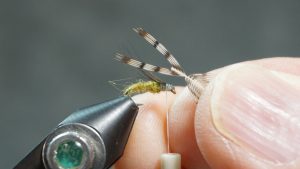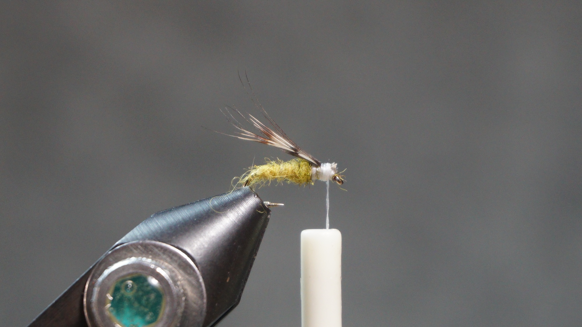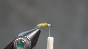 Dub a light olive, slightly tapered body; may want to build a thicker thread base behind the eye so the wing lays flat
