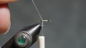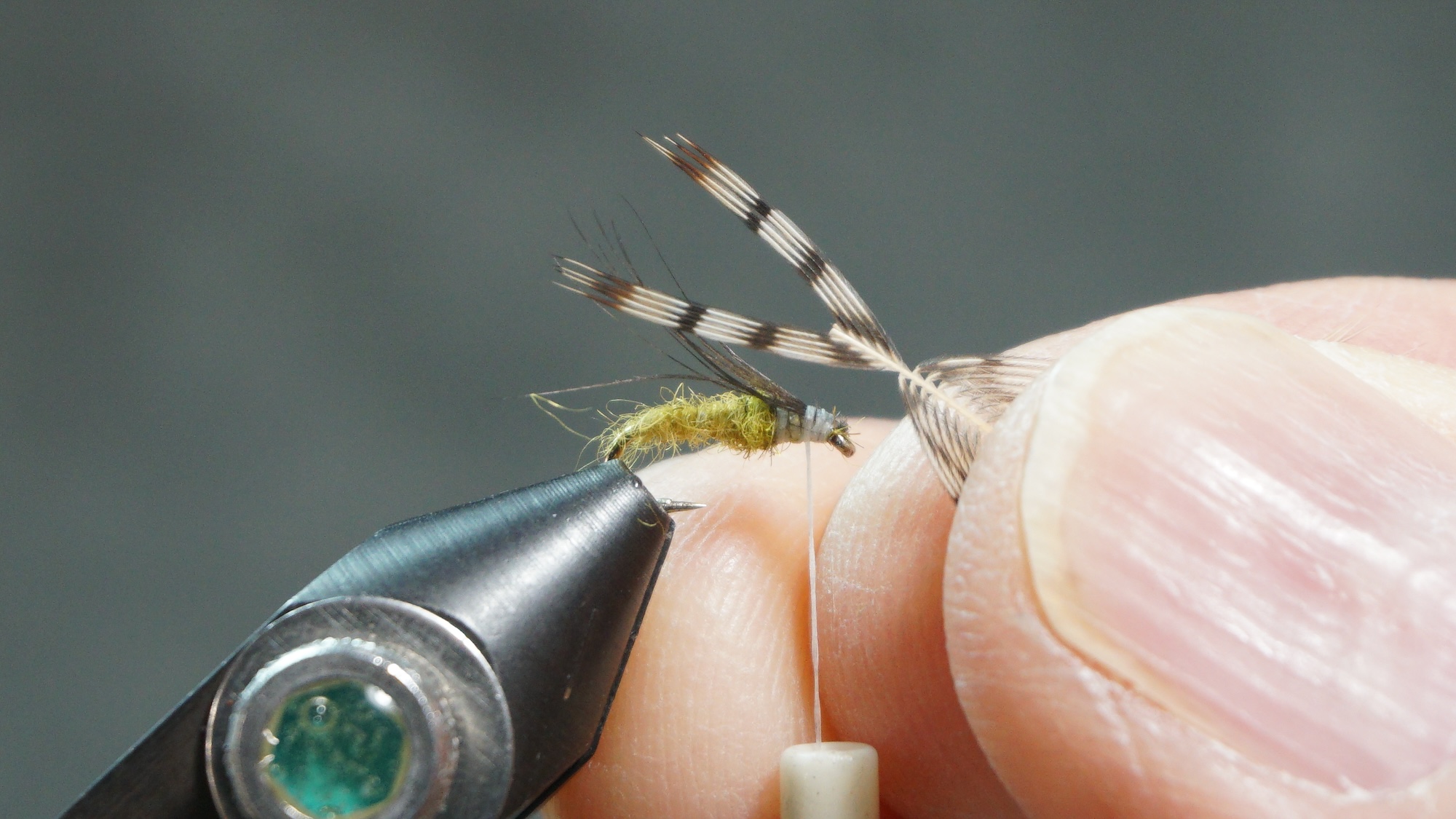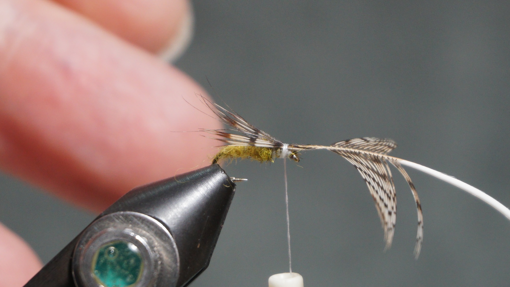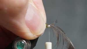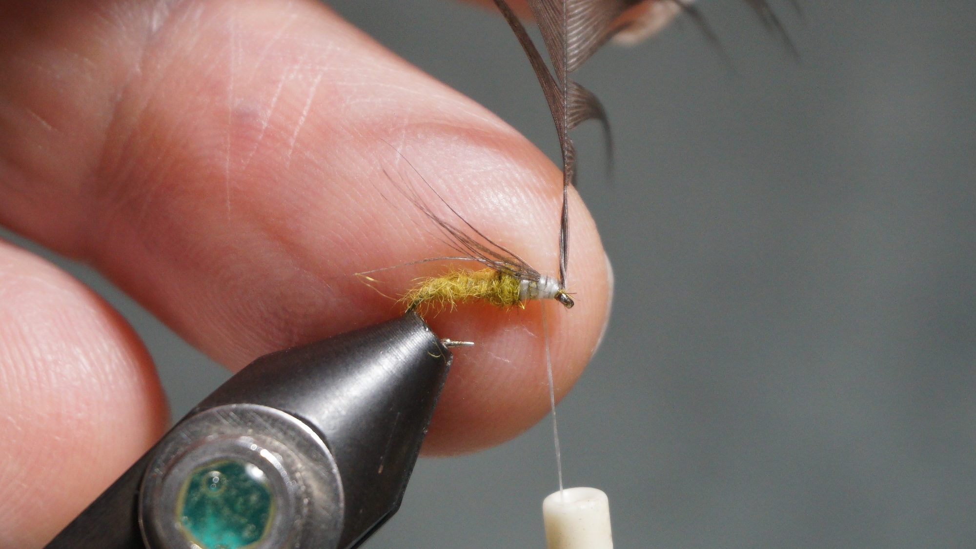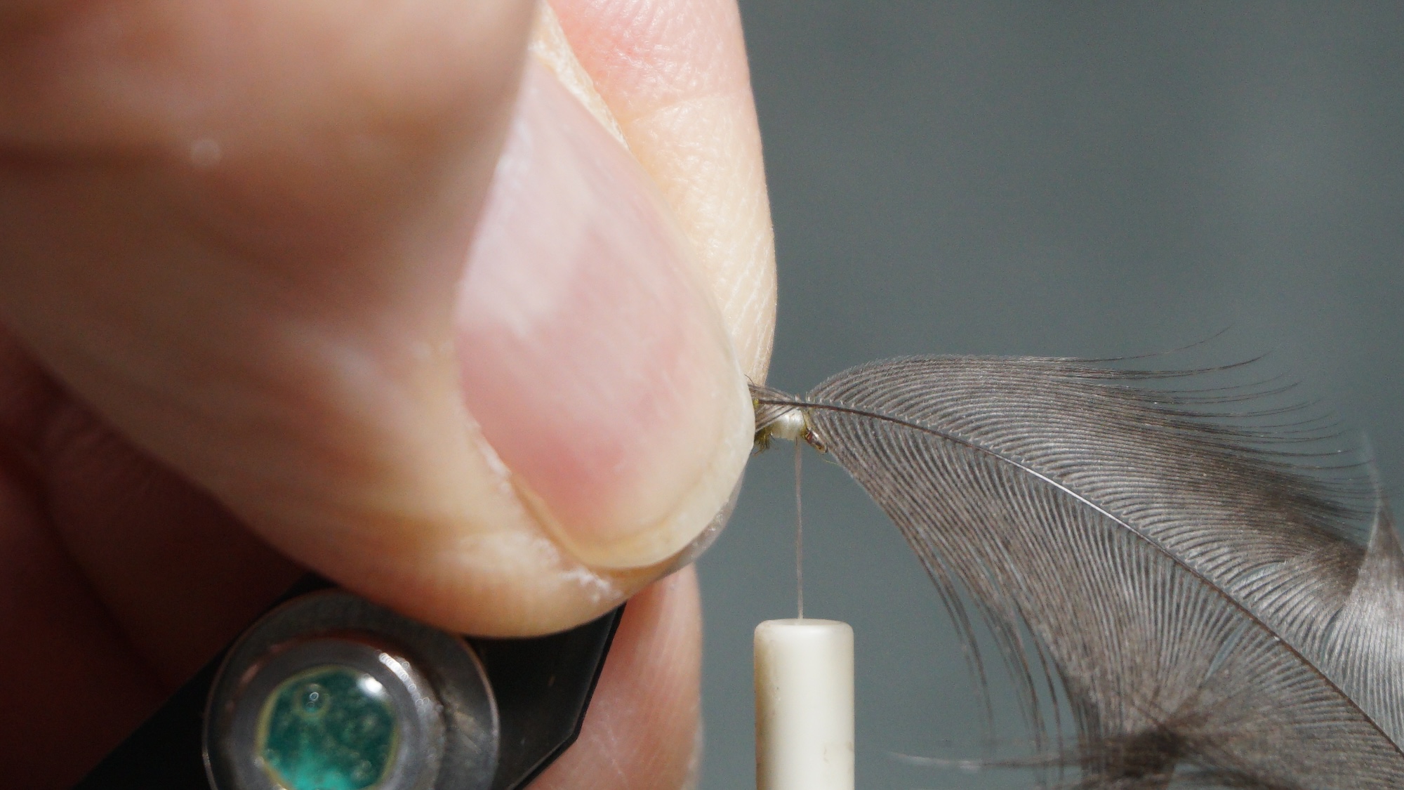 Tie in the V-notched, dark blue dun, hackle feather with just four fibers on each side of the V behind the eye with the fibers over the body with two loose thread wraps; pull the butt end of the feather forward until the hackle fibers are the length of the body; cinch and add a few tight thread wraps to secure the wing; clip off extra feather