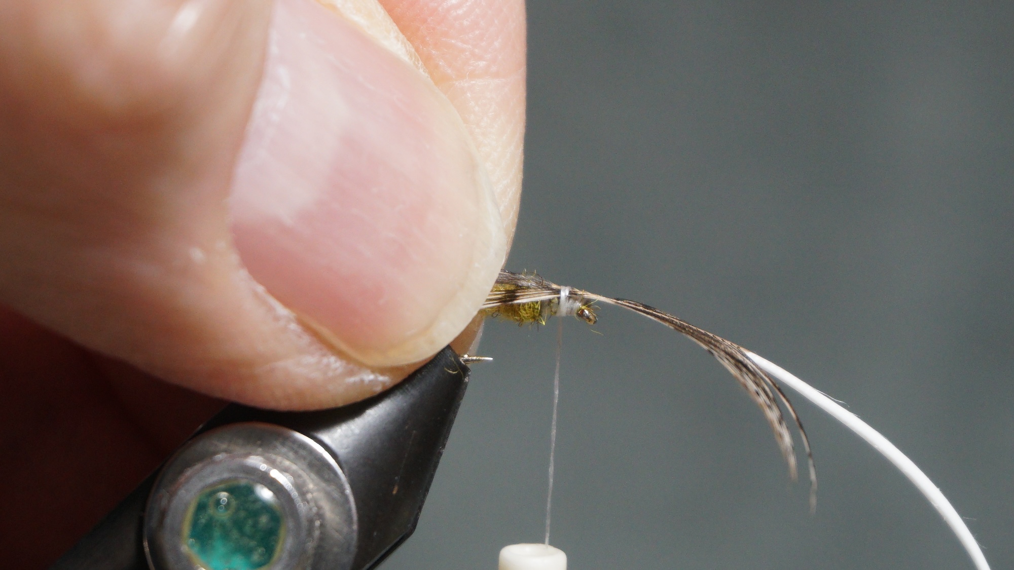 Tie in the V-notched, brown, partridge feather over the wing feather just behind the eye with two loose thread wraps; pull the feather by the butt end through the thread wraps until the fibers are to the hook bend or slightly longer; cinch and add securing wraps; clip off extra feather