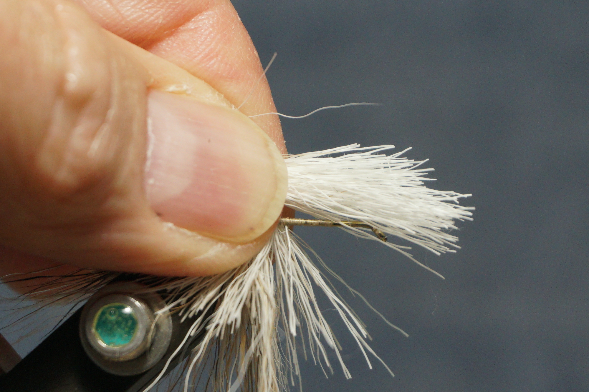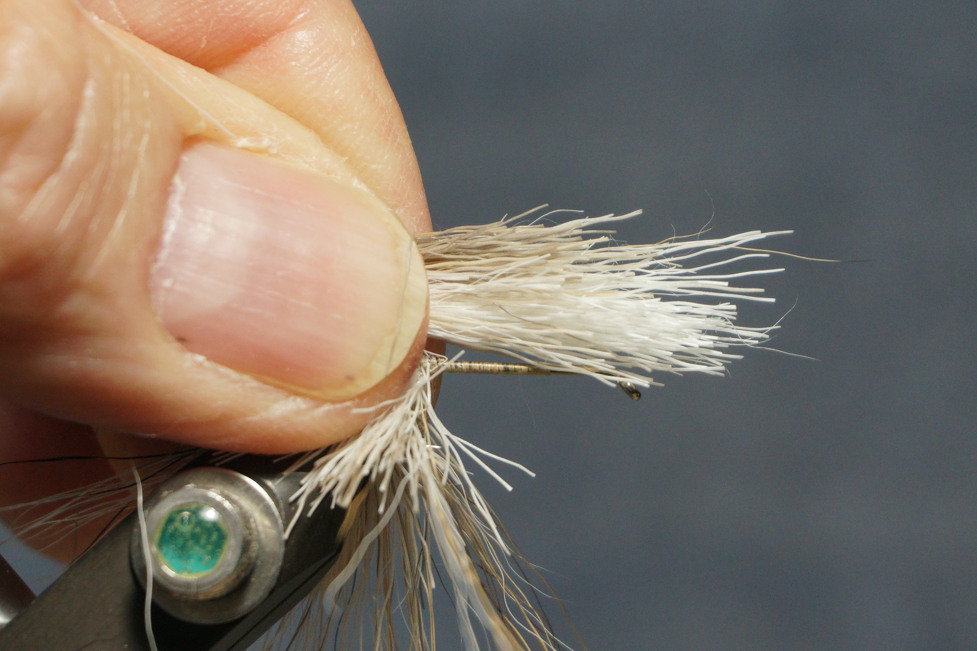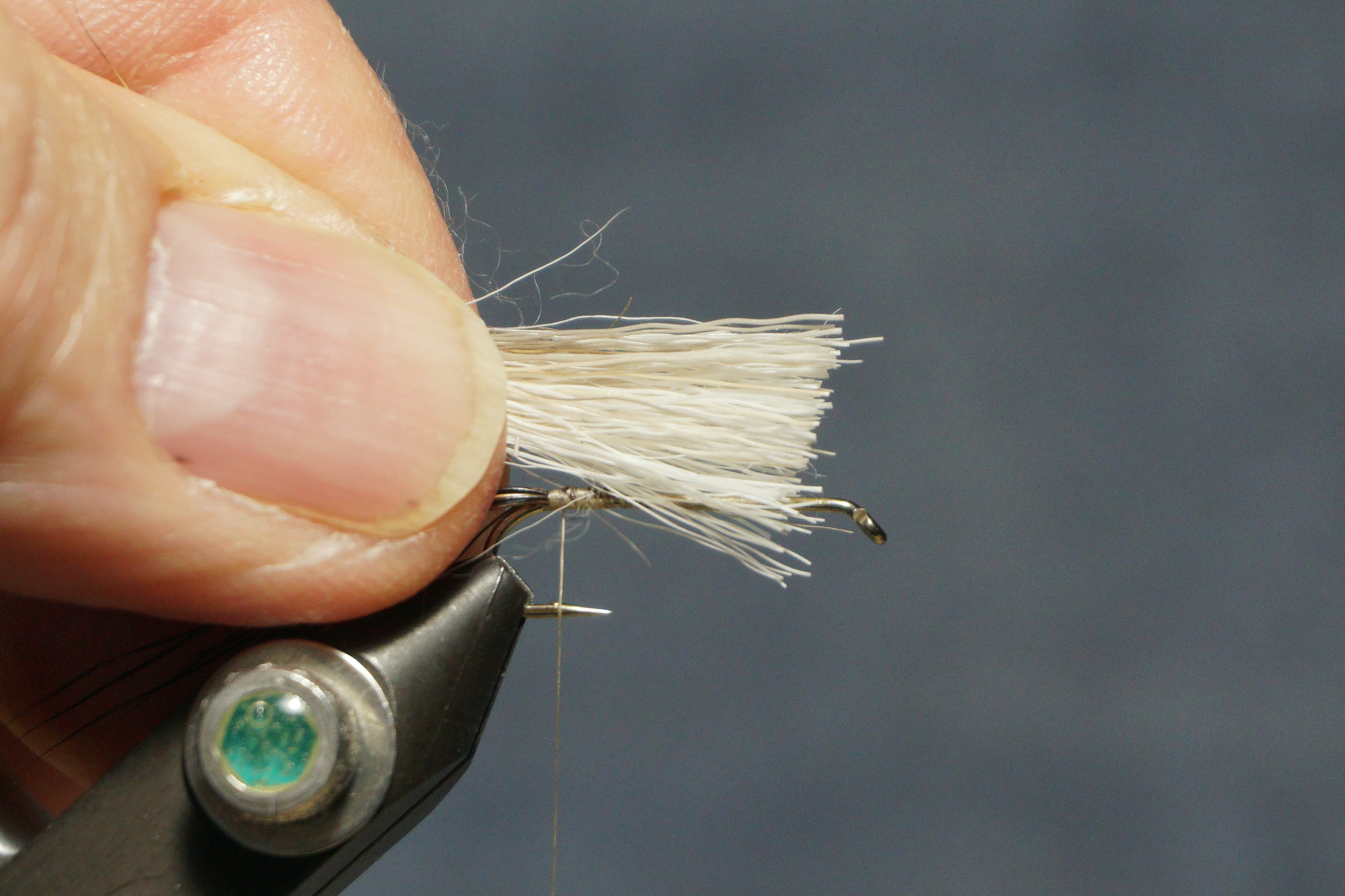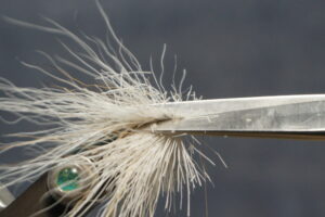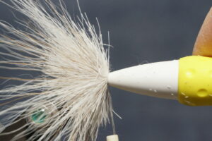 Spin a deer hair body; keep adding clumps and compressing toward the tail leaving enough room behind the eye for wings and hackle; two half hitches with your thread behind the eye will keep it in place while you clip – it will also keep your thread on the shank in case you happen to cut the thread while clipping