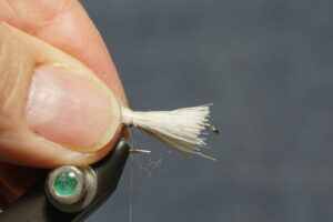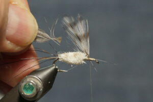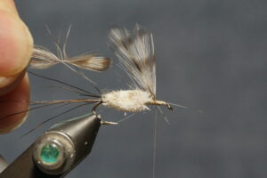 Tie in wings; thread wrap in front and behind, figure 8 to separate the wings