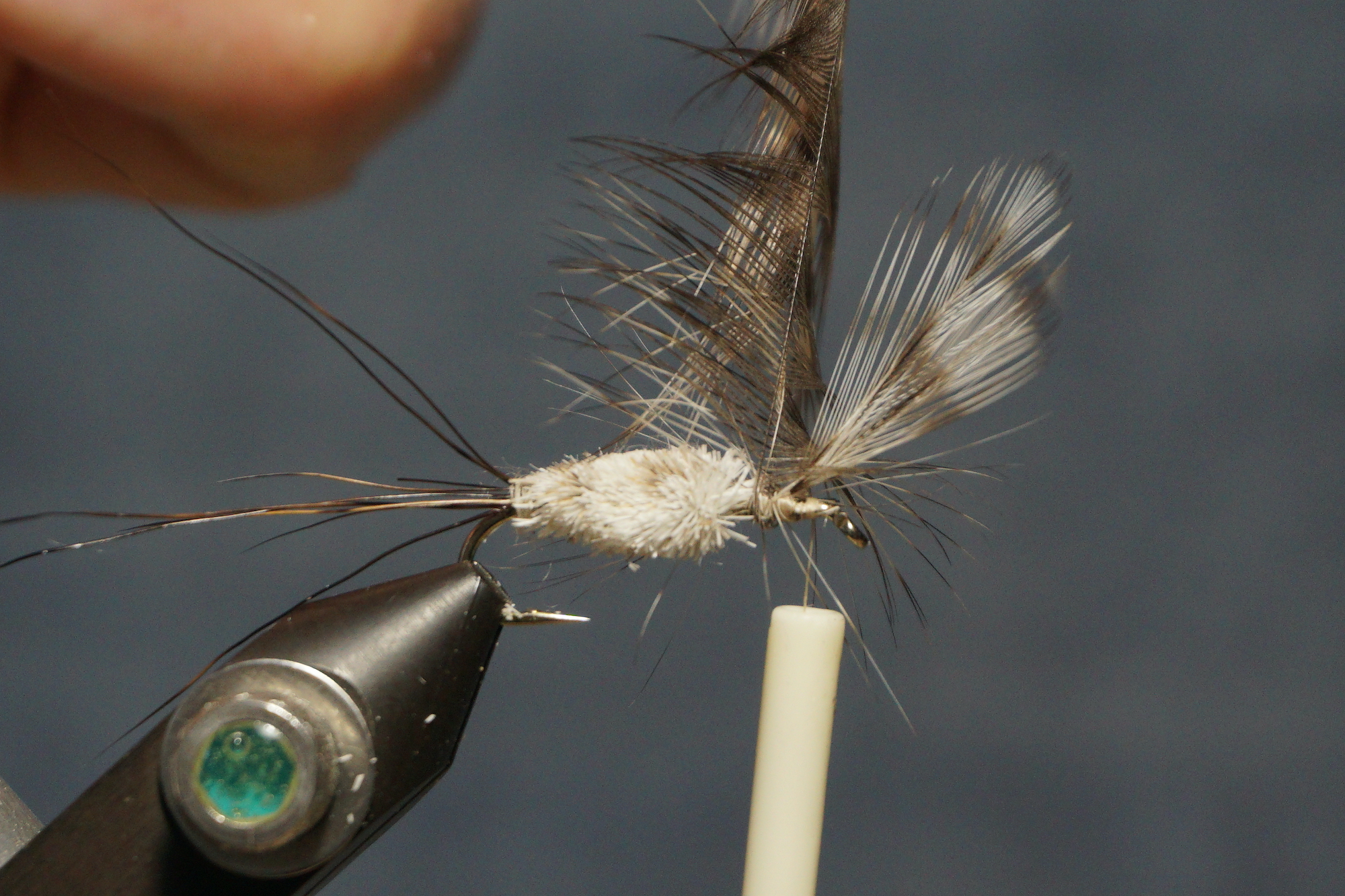 Tie in hackle (stack two hackle feathers together, pinch out the tip, and cut to a small triangle, tie the triangle between the wings; wrap twice behind wings and twice in front of the wings