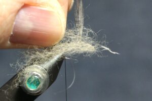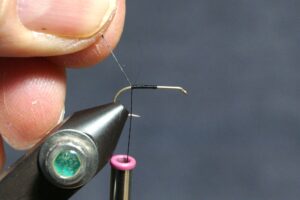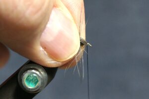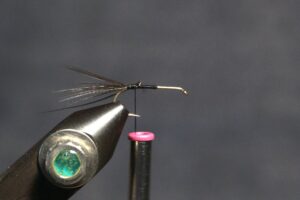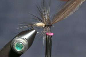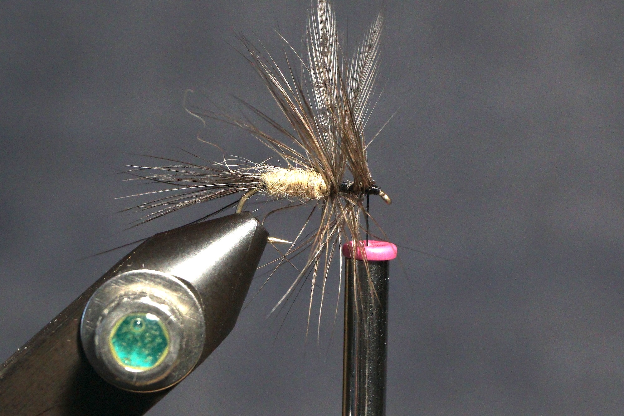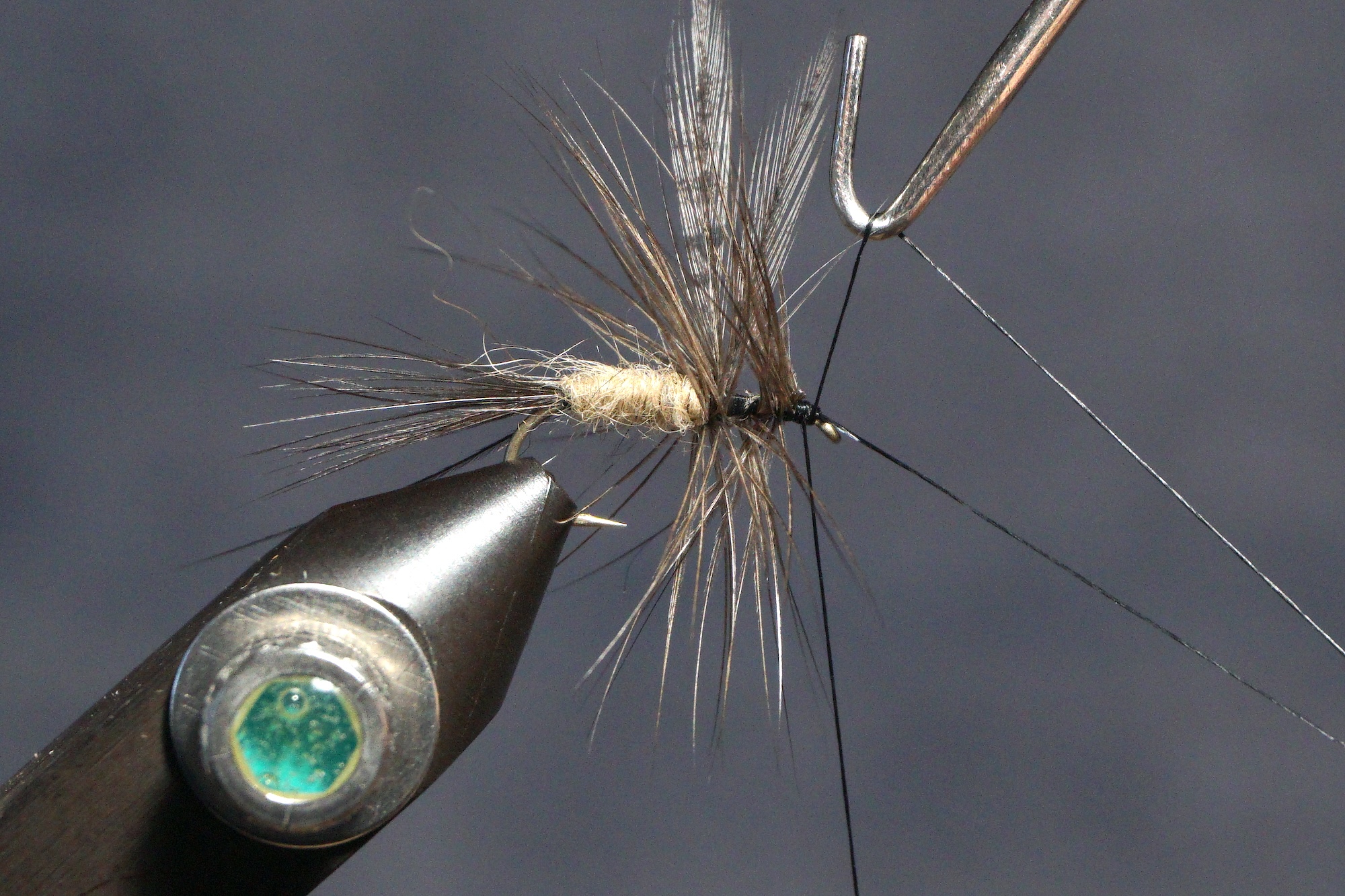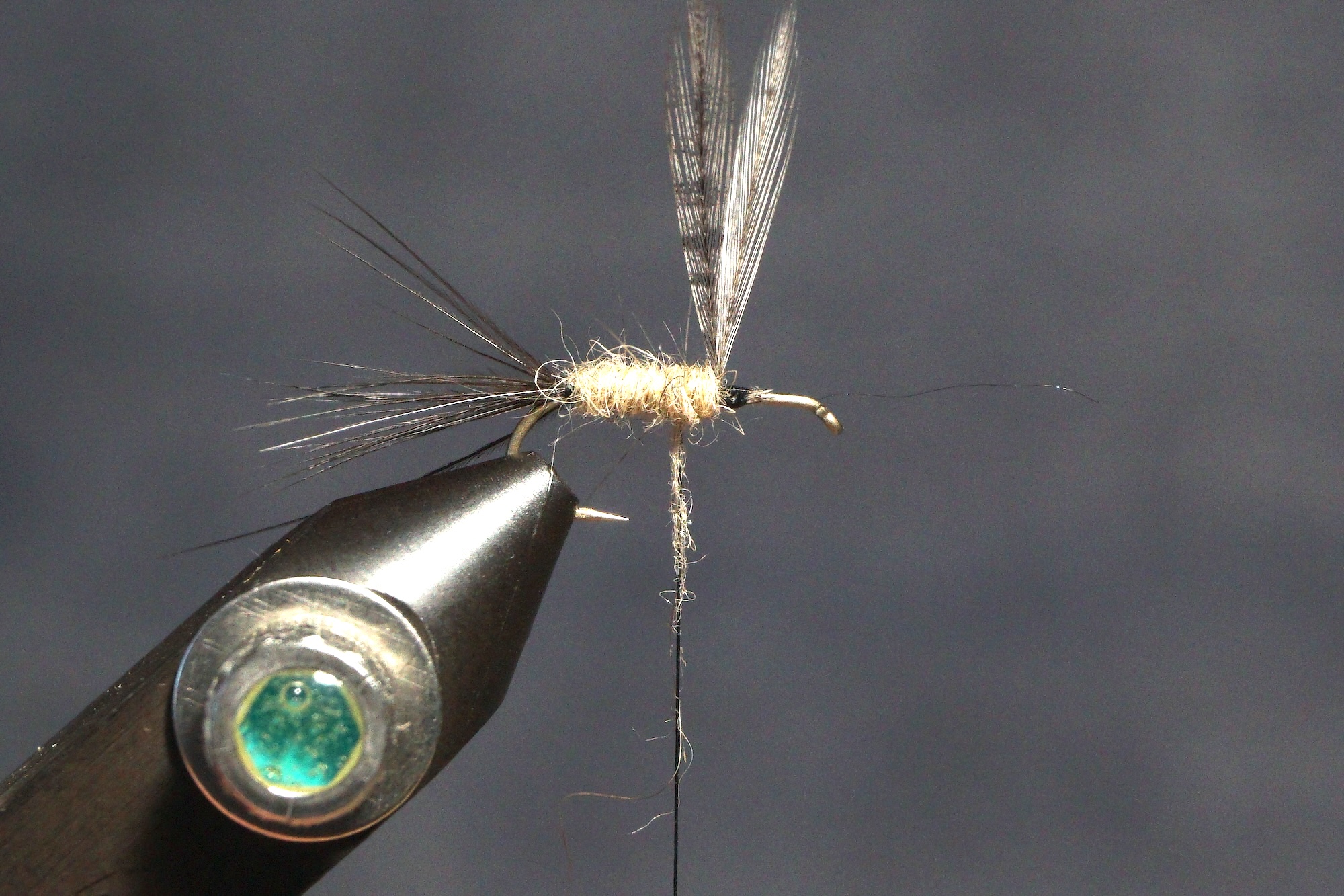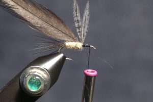 Take thread back to tail; dub in a body the color of a mayfly body stopping behind the wing
