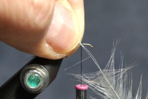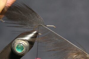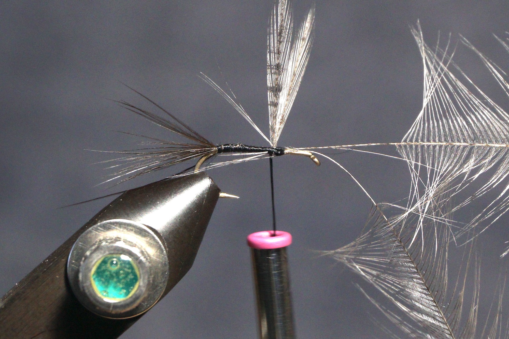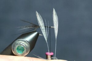 Choose two hackle feathers in a light color for wings; measure the tips from behind the eye to the far end of the hook bend; strip off the fibers below the measured tip; tie in the wing a couple eyes length behind the eye; pull wings forward and thread wrap behind them to stand them up.