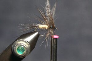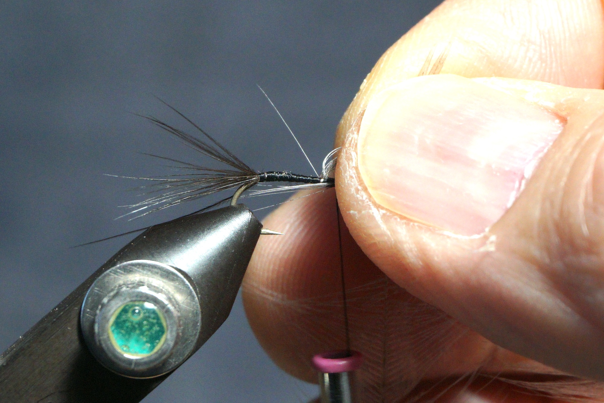 Tie in a dark dry fly hackle (1.25 to 1.5 the hook gap) behind the wings; wrap twice behind the wings and two or three times in front of the wings; tie off; pull back on hackle fibers to wrap the head; clip off extra hackle