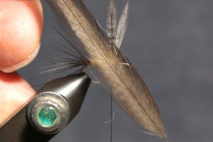 a basic adult mayfly imitation using hackle feather tips for the wings