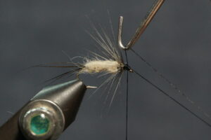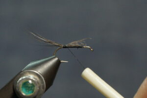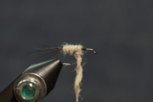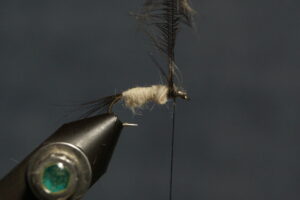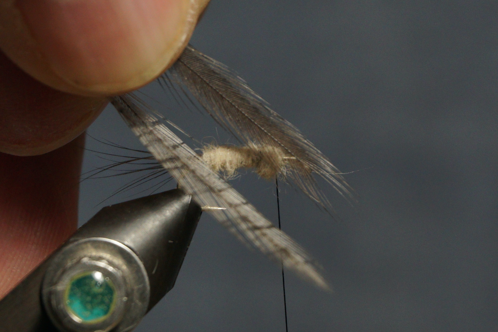 Tie in a few fibers of Grizzly (or brown and grizzly) hackle fibers for the tail – a little less than hook shank length