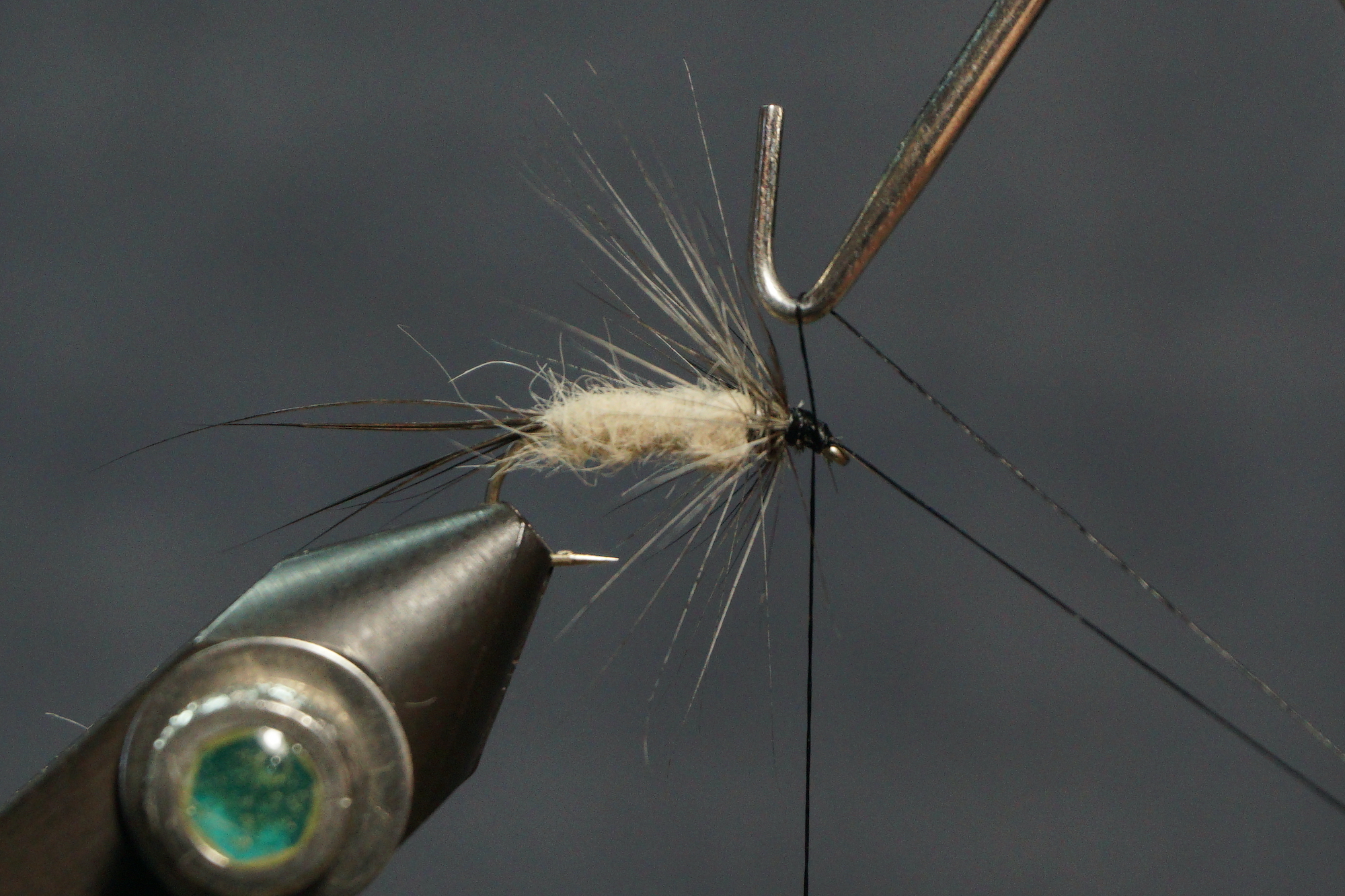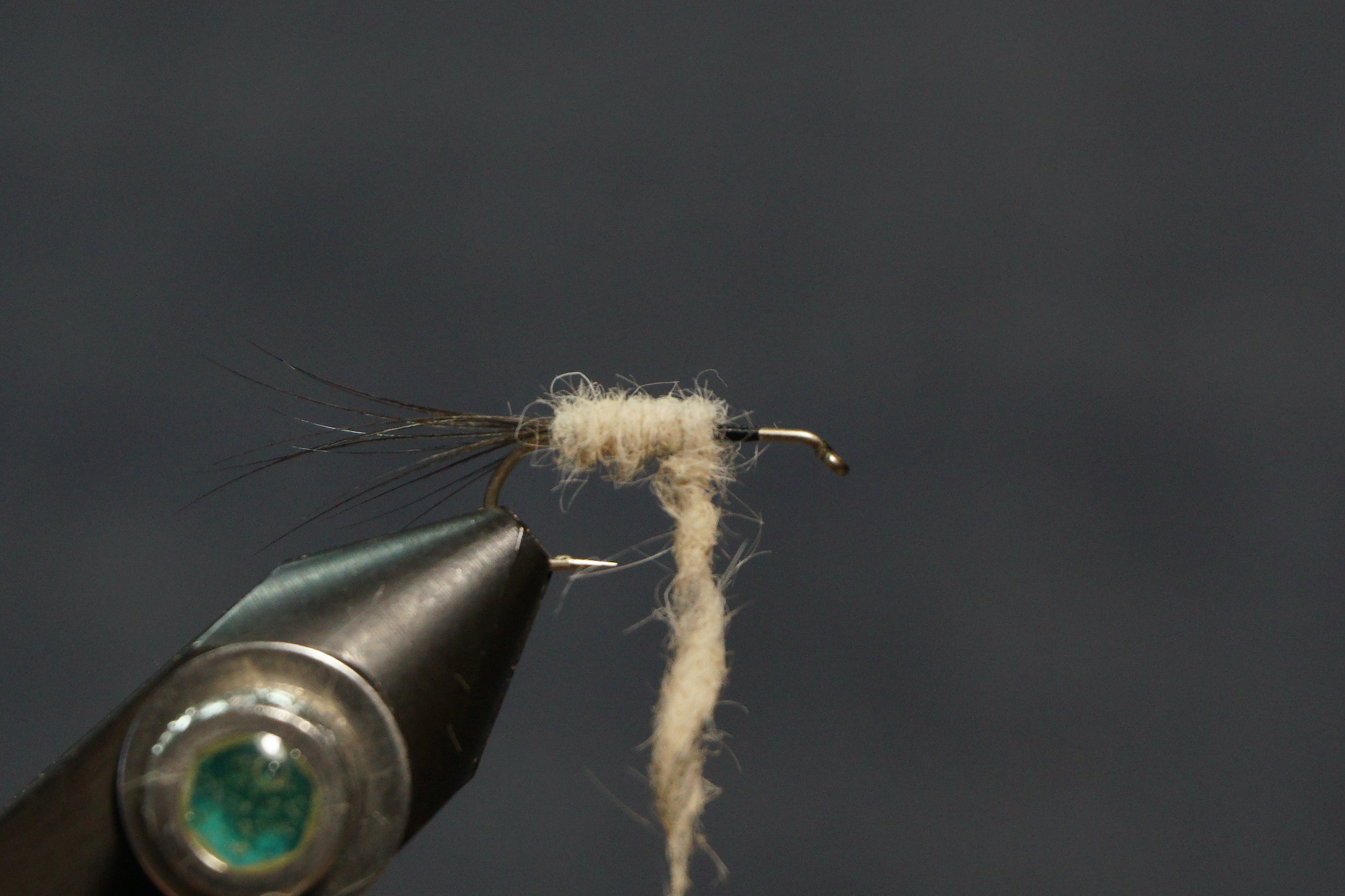 Dub in a muskrat or rabbit fur (or other natural brown / gray) body; leave room for the front hackle and head