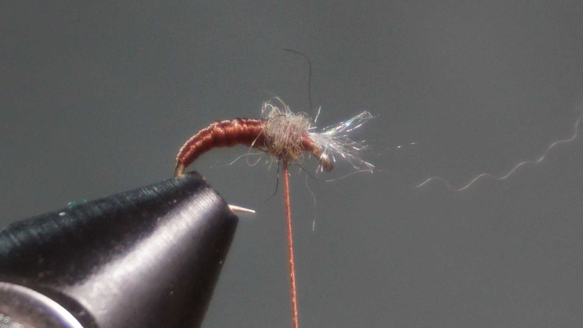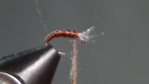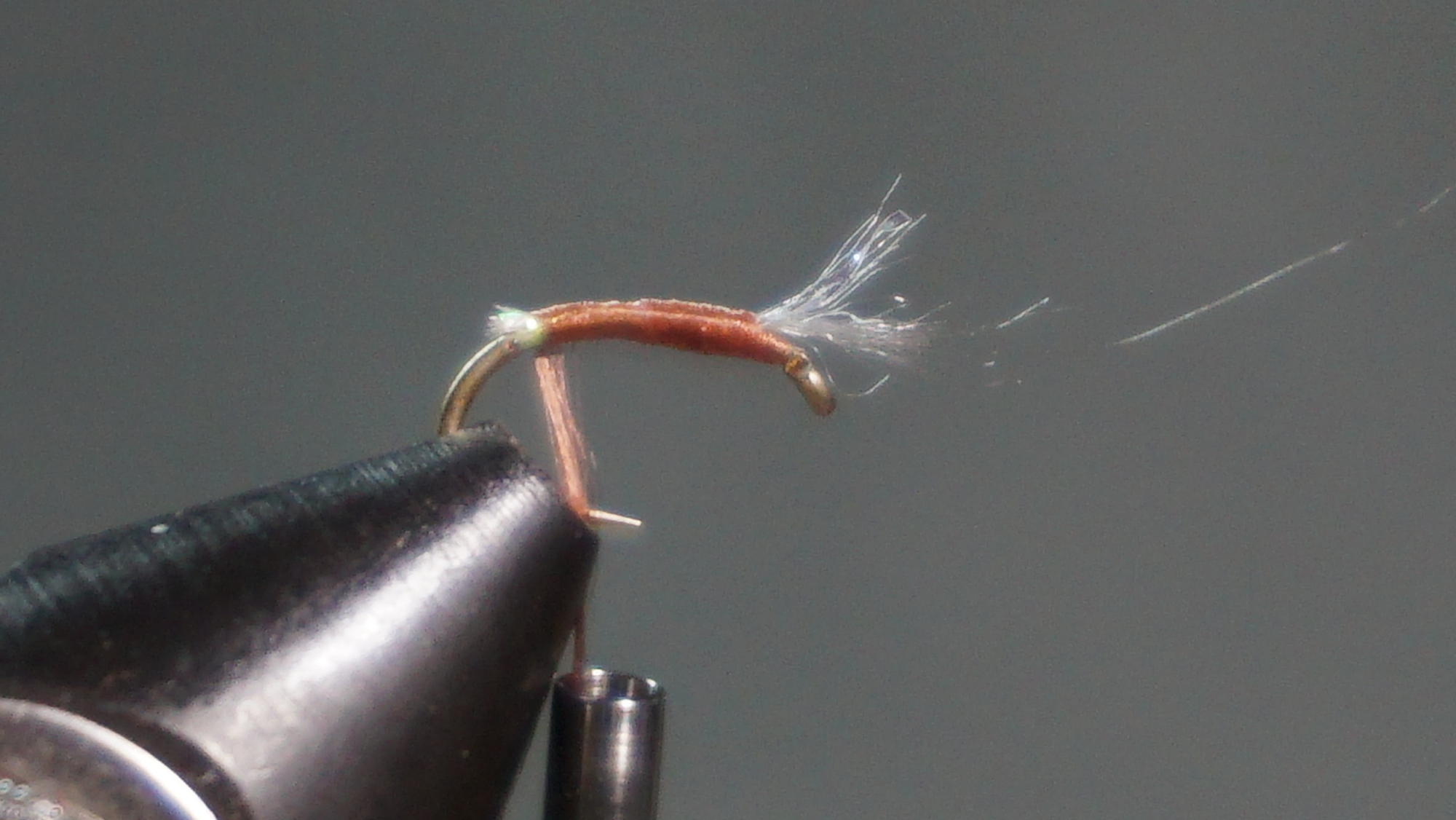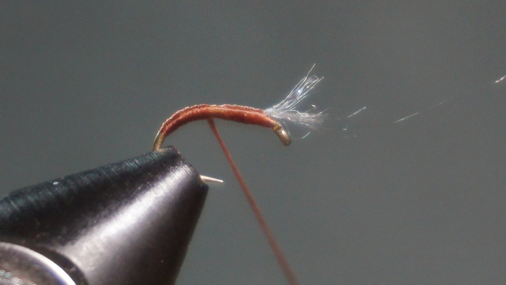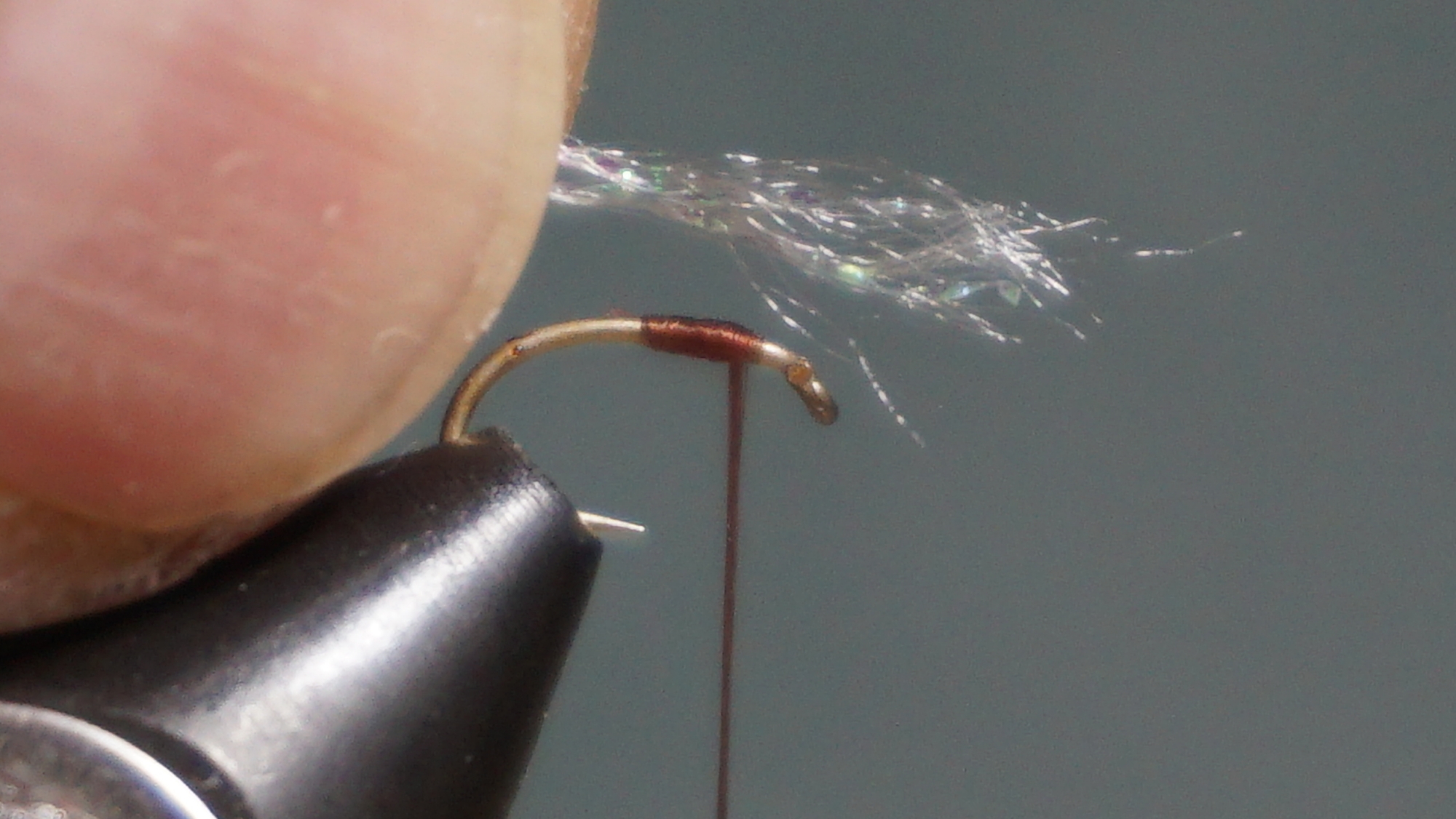 Optional: tie in two strands of white glamour madeira with ends over eye for gills