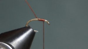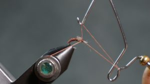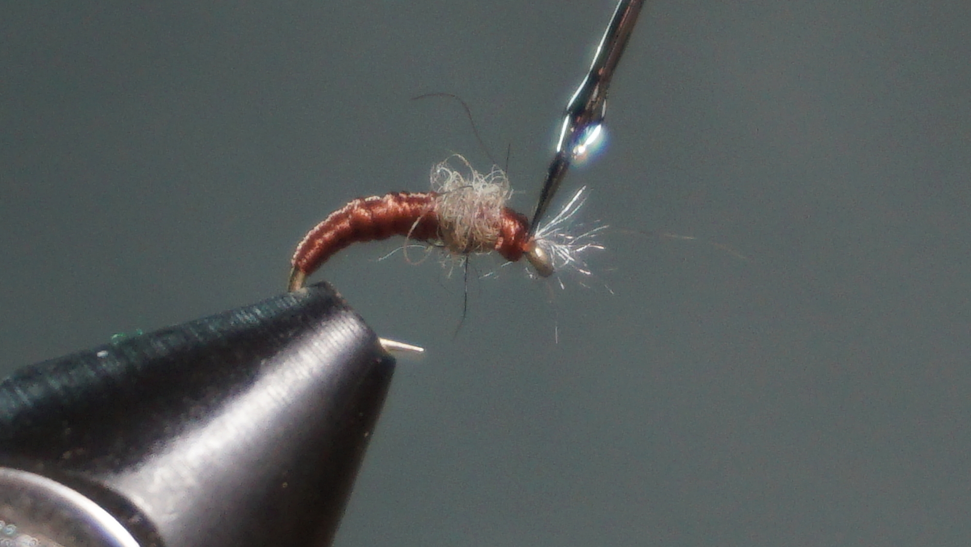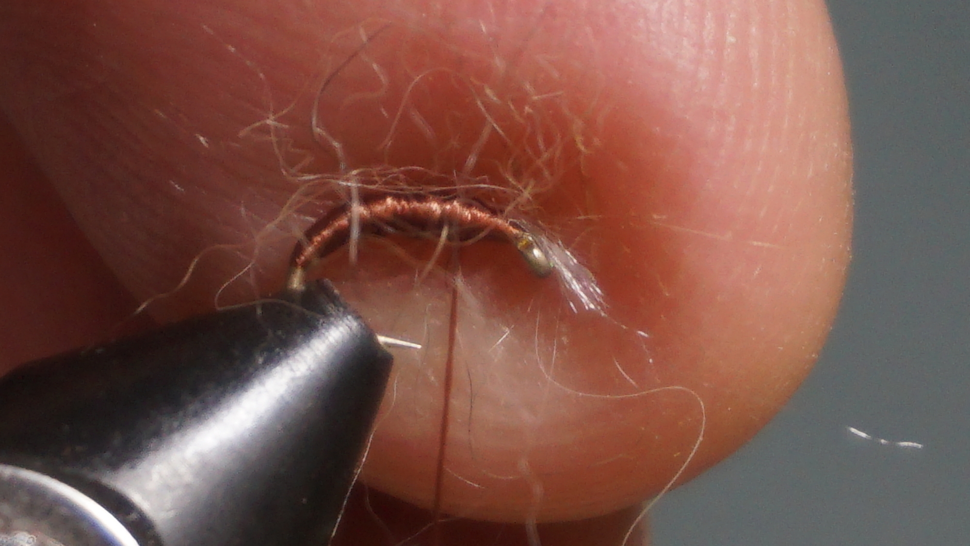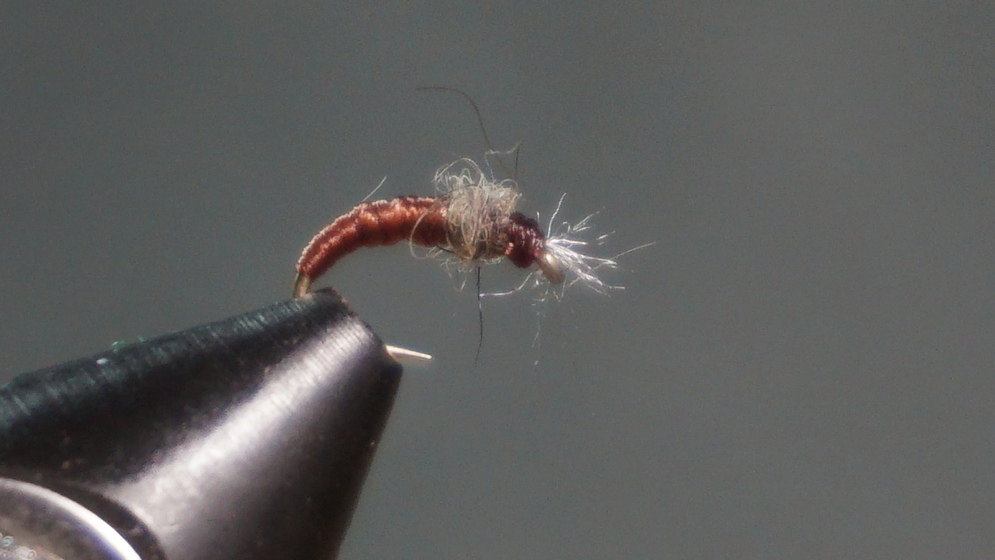 Optional: tie in two strands of white glamour madeira with ends over eye for gills