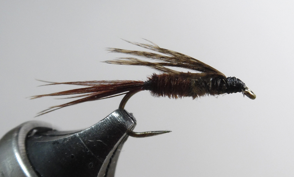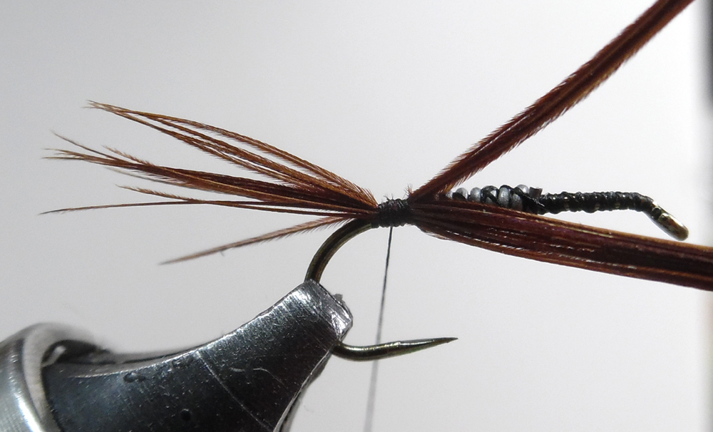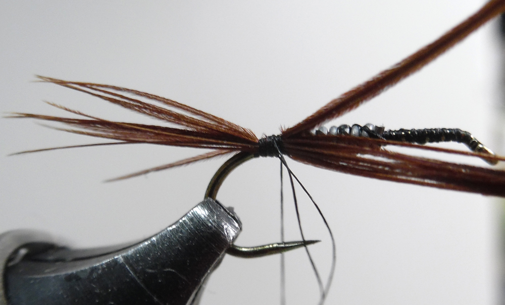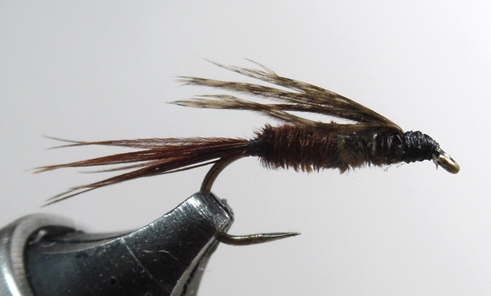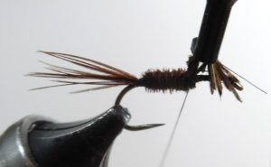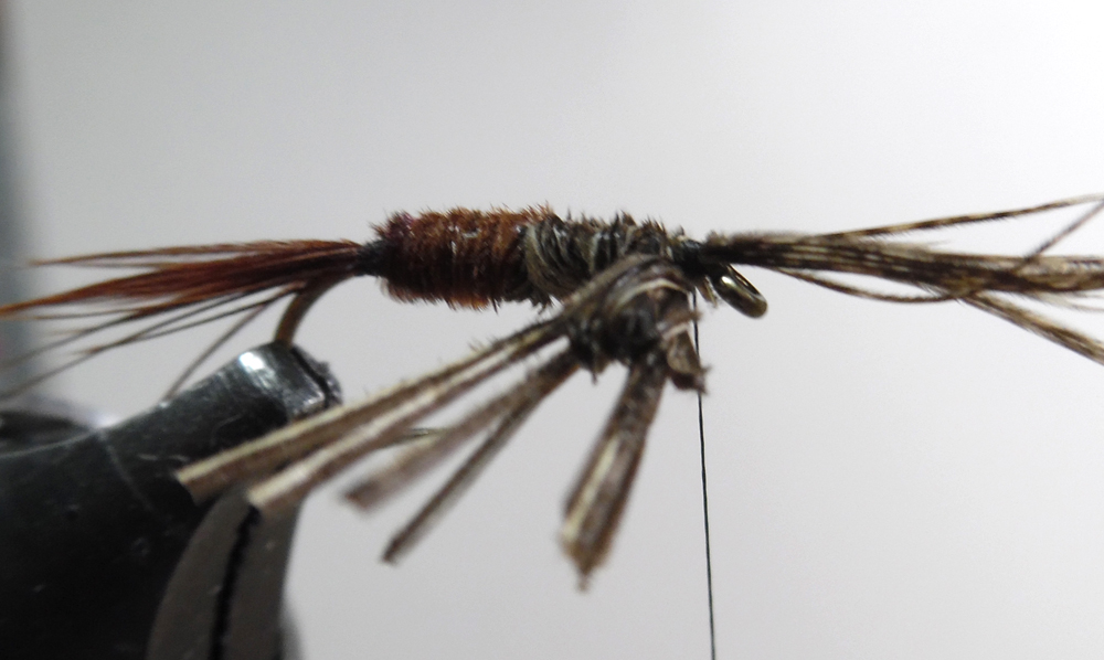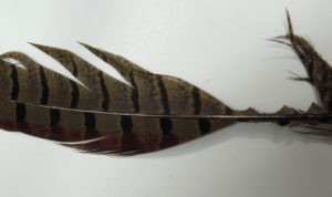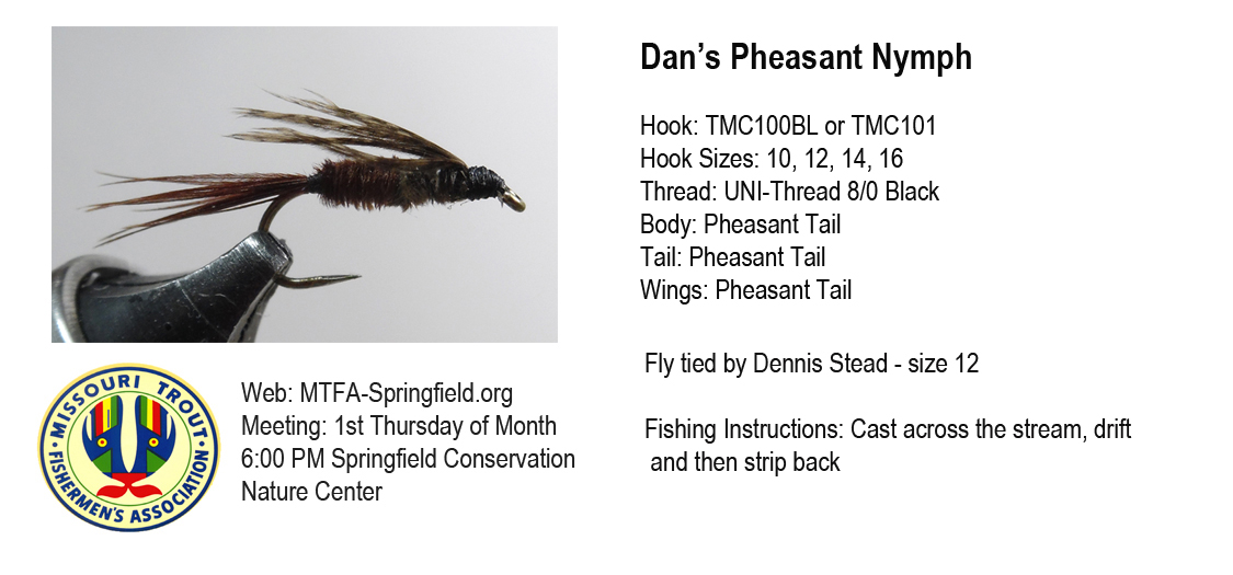 Dan’s Pheasant Nymph. When Dan Ditzler gives you a fly, you know that he has fished with it and it caught fish. It might even be one he has already fished with. At our last meeting he handed me this one and said he ties it with just pheasant, smiled and walked away. Great! After tying 17 flies, I think I got it and can take you through the steps I use. I use both sides of the pheasant tail feather. One side of the feather has barbels that separate nicely (use on the tail). The opposite side the barbels cling together (use on the wings).