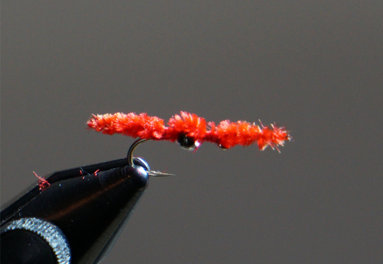 Tie chenille to top of hook at bend and again in front of the bead with thread wraps