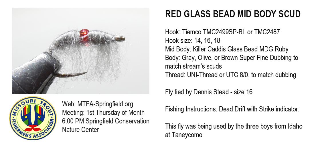 While fishing at Taneycomo, I met three men from Idaho. They using using scud flies with a variation. The first one had a red glass bead head and the sizes were 20, 22, 24. The other fly had a red glass bead mid body and the hook sizes were larger 14, 16, 18.