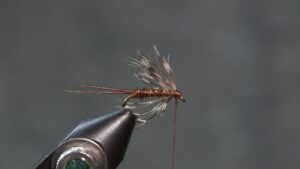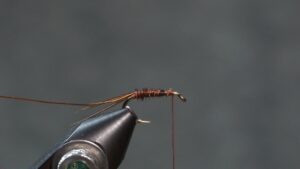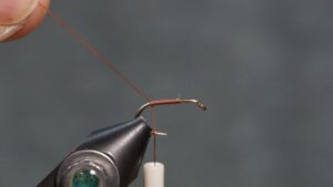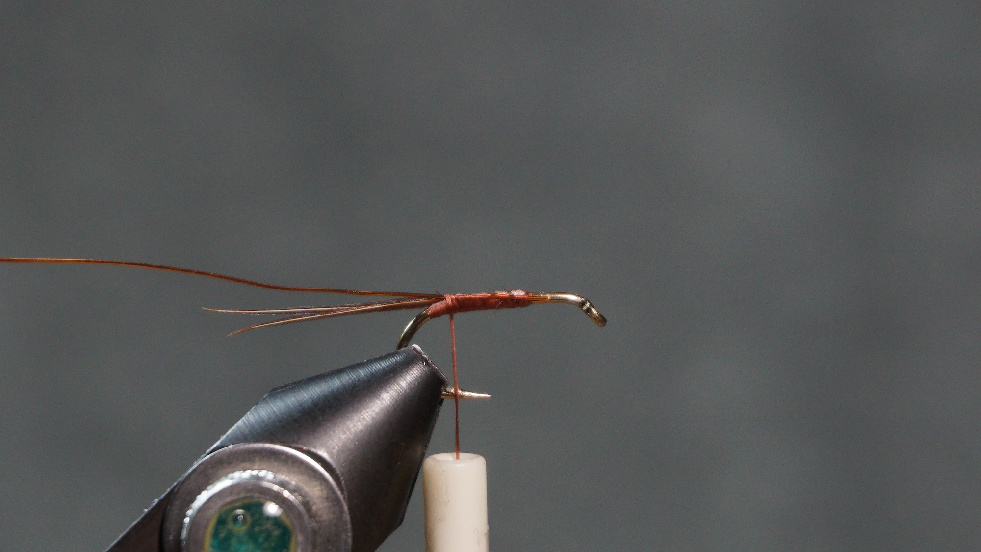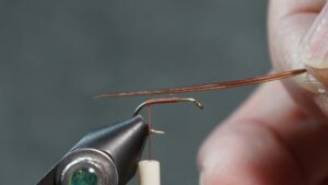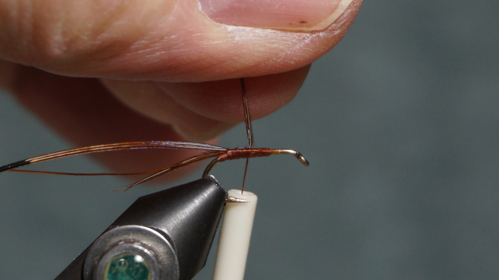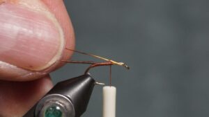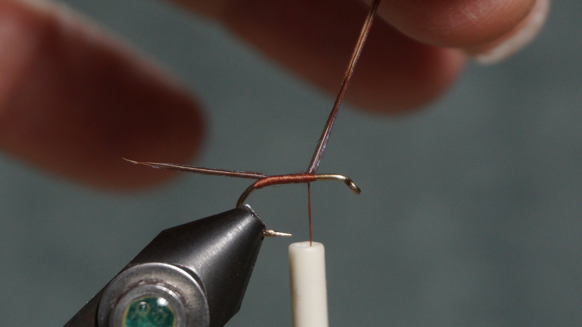 Tie in two fibers from a pheasant tail feather for the tail; hook shank length; tie off, clip butts