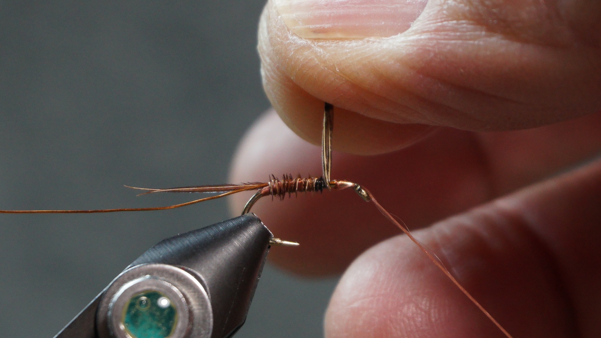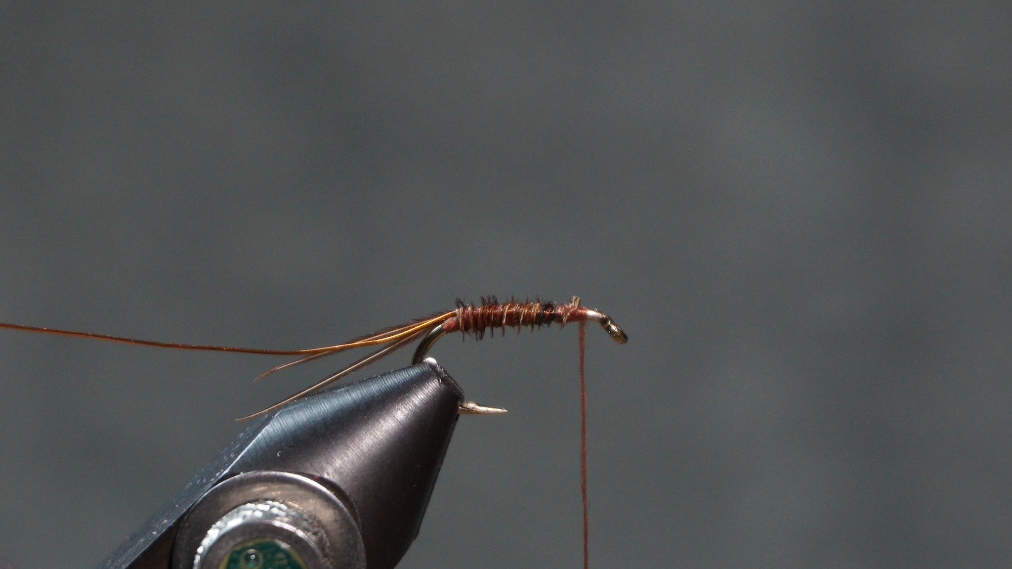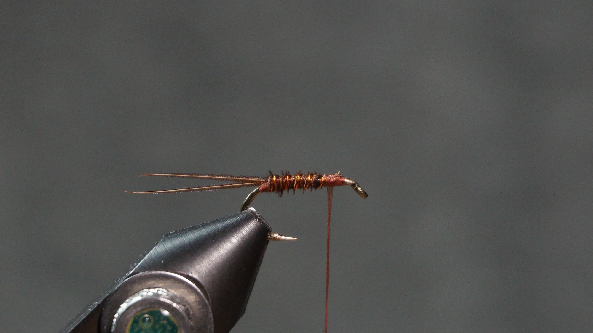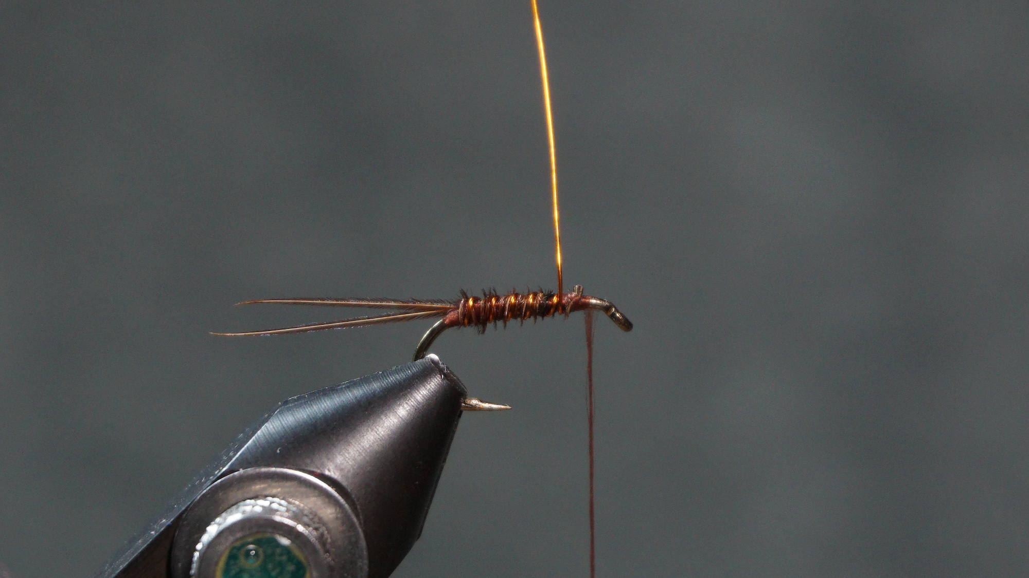 Counter spiral wrap the wire rib over the body; tie off and helicopter or clip