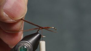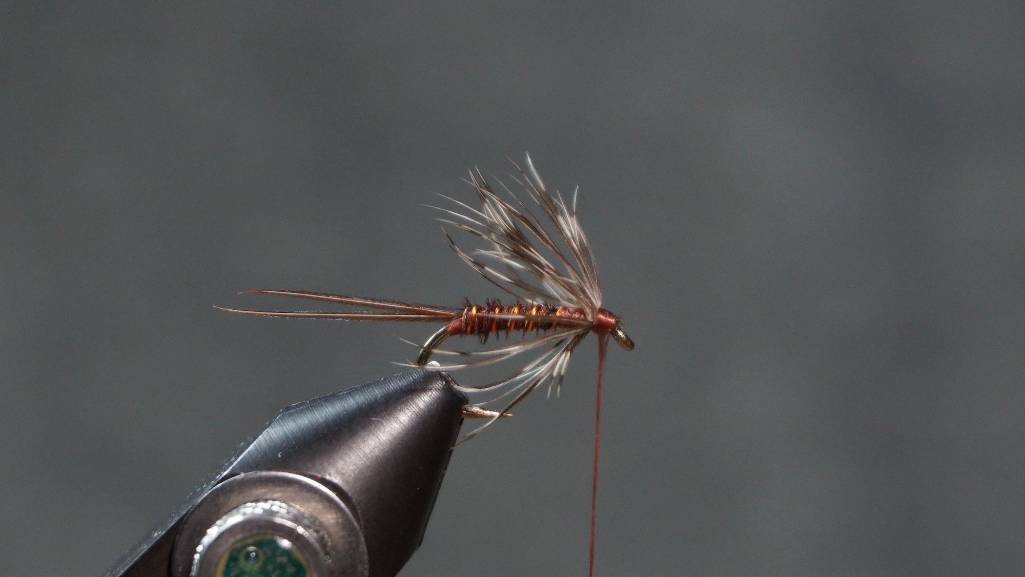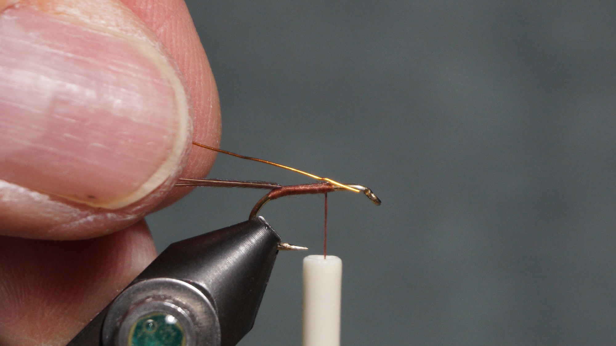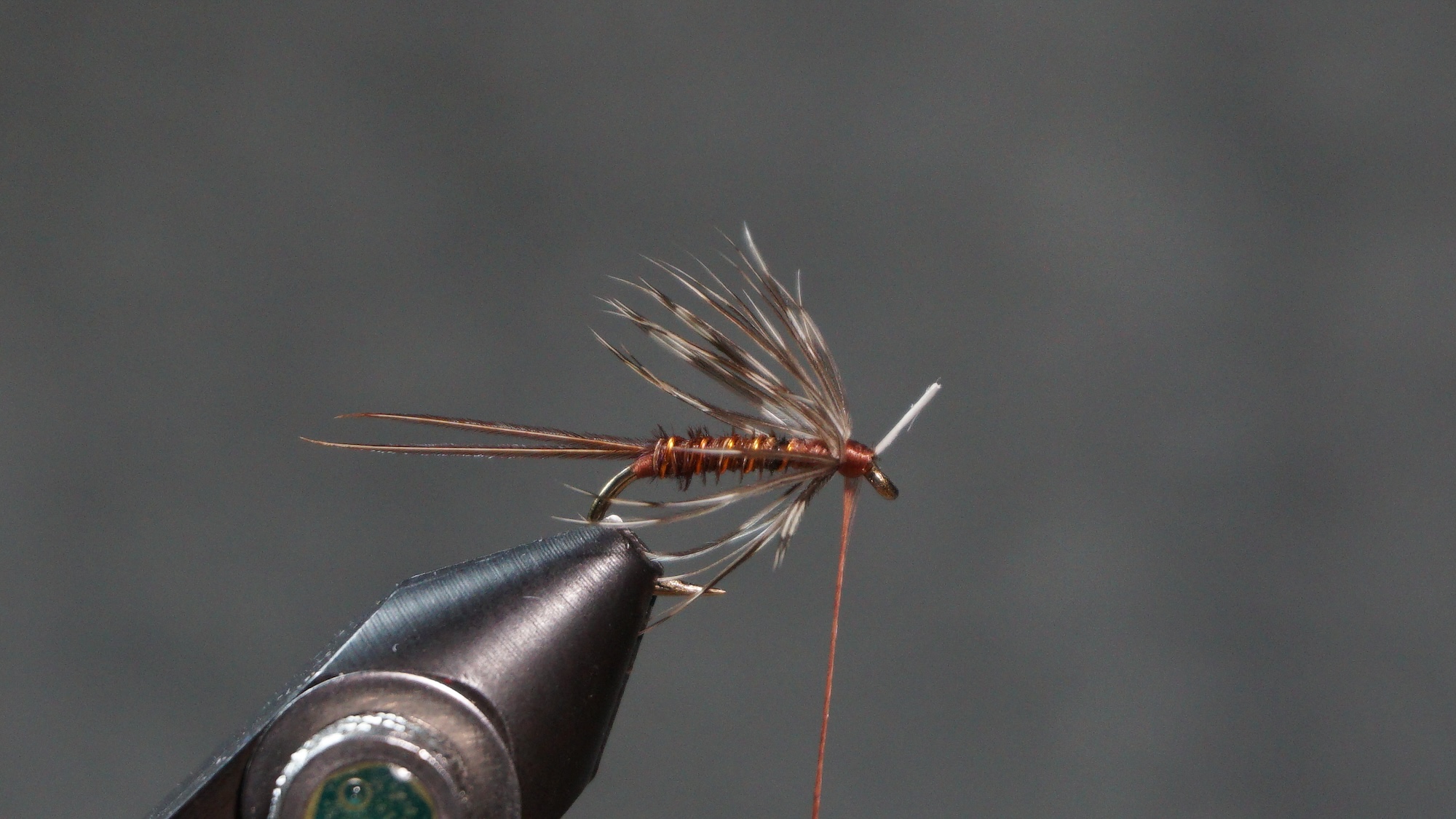 Counter spiral wrap the wire rib over the body; tie off and helicopter or clip