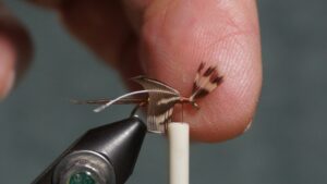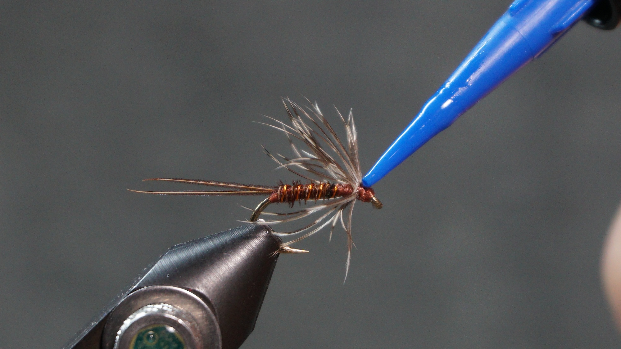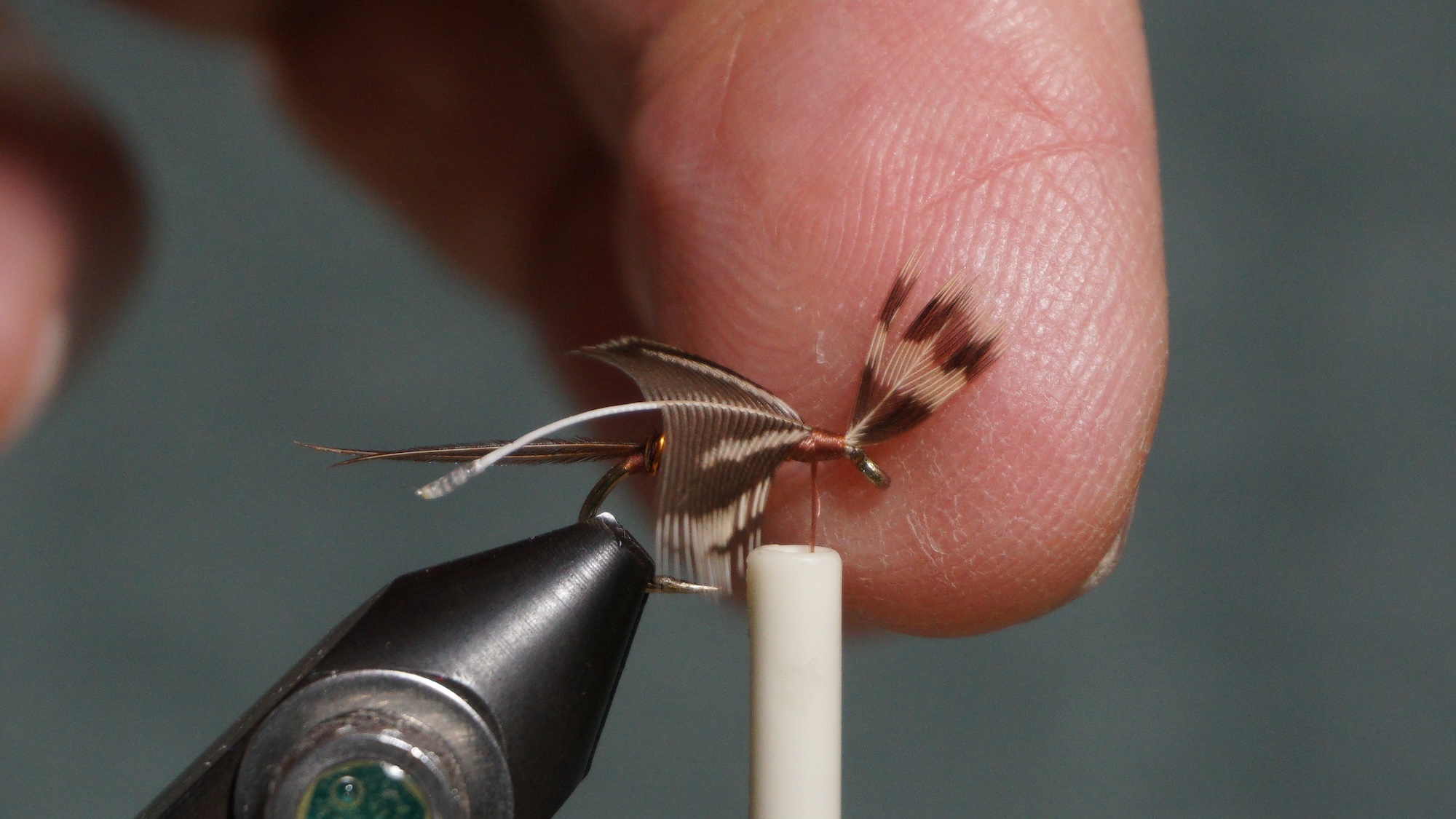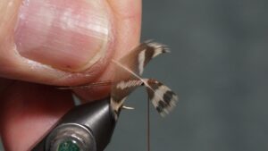 Tie in two (or quantity as needed) fibers from a pheasant tail feather; tie down by the tip end two or so eye lengths behind eye and wrapping to tail (note: these fibers break easily close to the tip, so tie in 1/4 from the tip end); clip off tips; touching wrap fibers toward eye; leave room for the hackle and head; tie off and clip butts