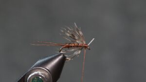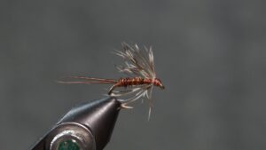 Choose a soft hackle 1.5 hook gape; separate out the tip and pull back on the remaining fibers; tie in by tip; clip tip out; wrap hackle so fibers lean back toward bend; tie off; clip stem