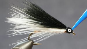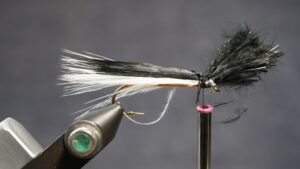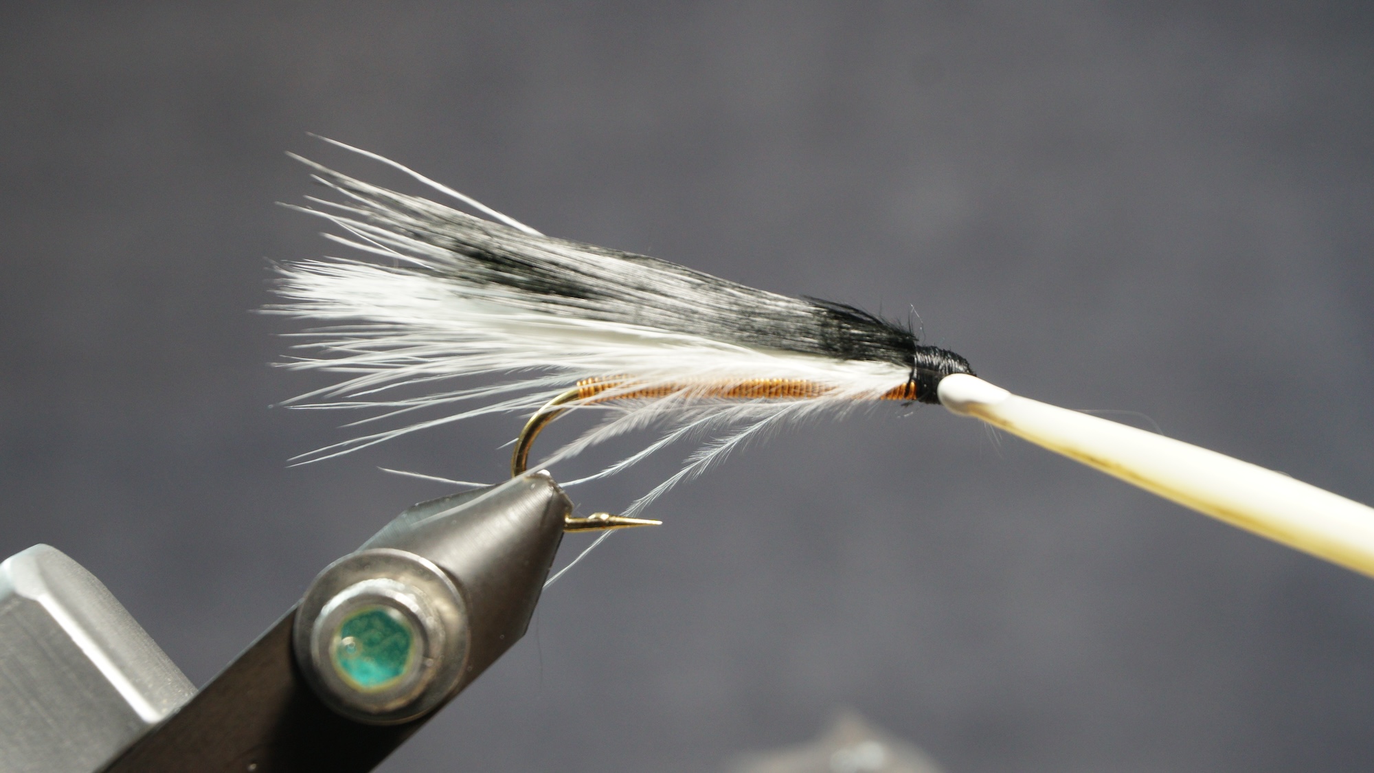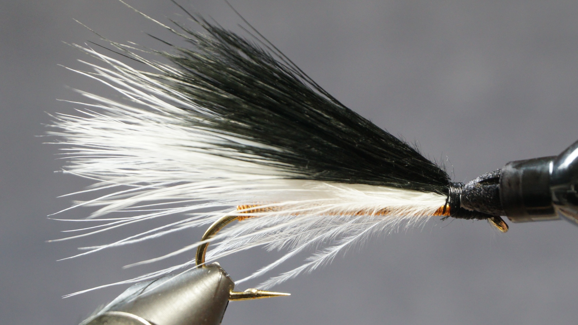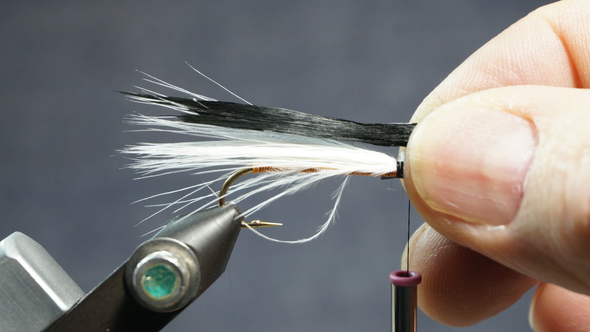 Measure a clump of black or dark marabou slightly shorter than the white; tie in on top of white; clip extra at an angle