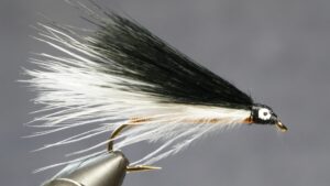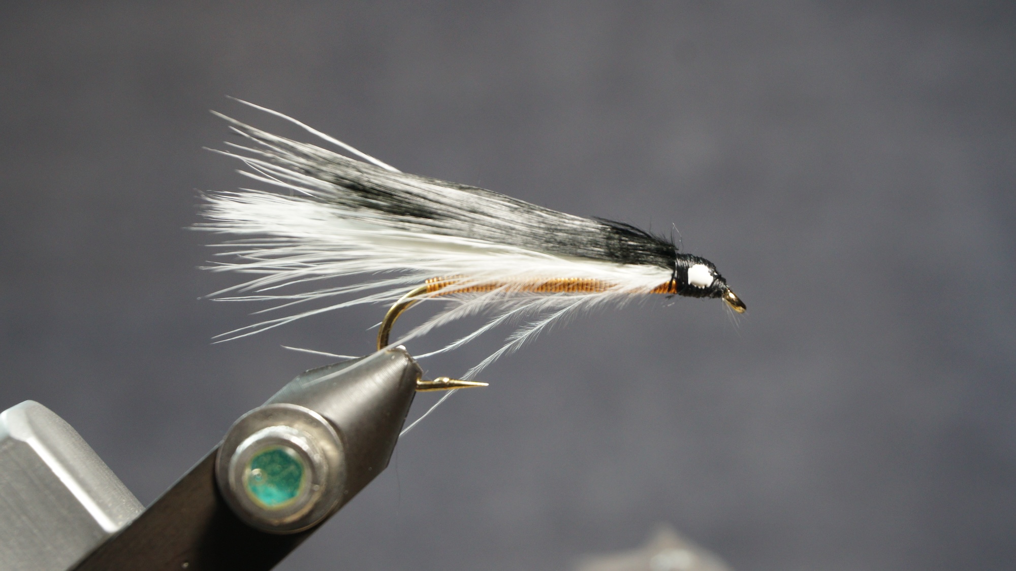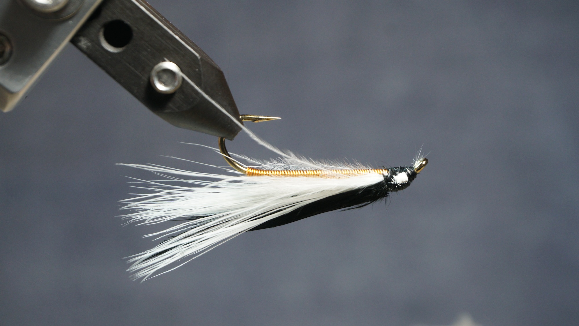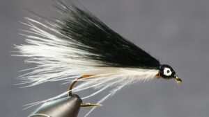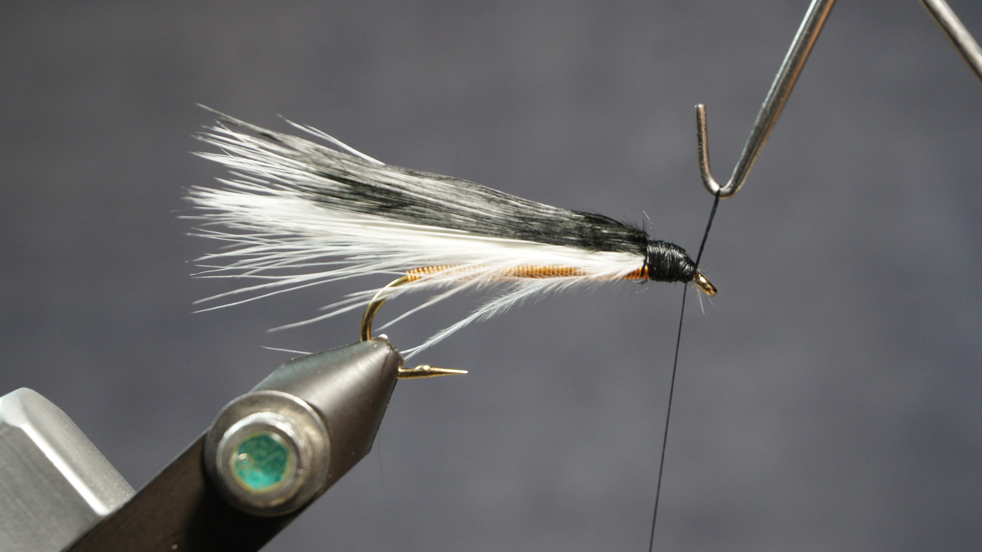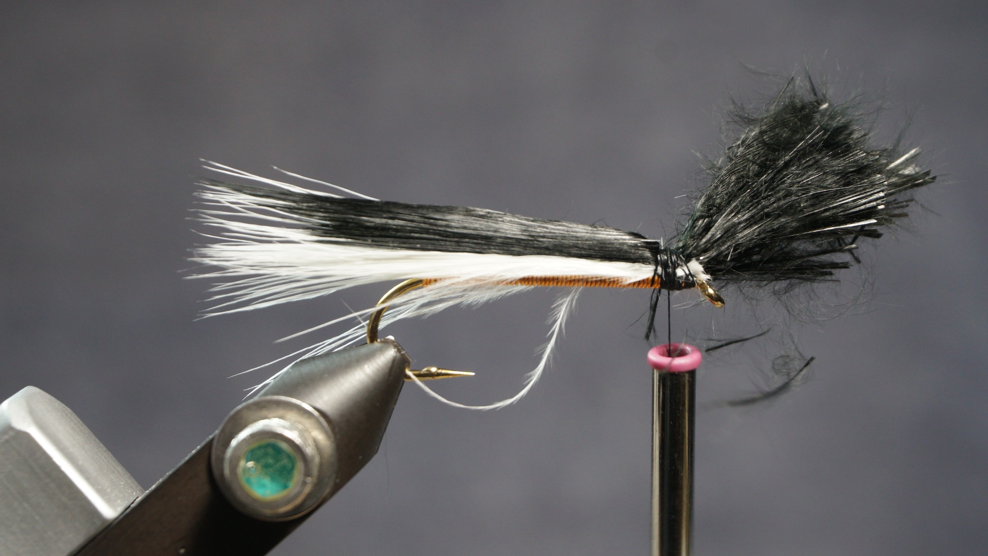 Measure a clump of black or dark marabou slightly shorter than the white; tie in on top of white; clip extra at an angle