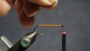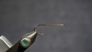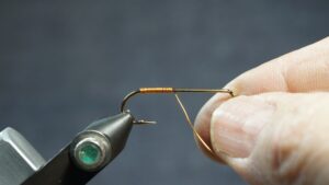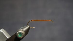 Wrap the hook shank with #12 brass wire, or substitute as desired, or weighted wire with tinsel overlay